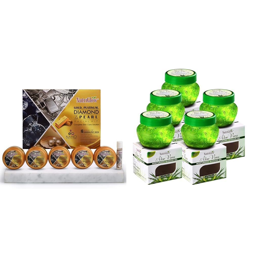 HomeBeautyFace CareFacial KitsNutriGlowPlatinum Diamond Gold and Pearl Facial kit 6-Pieces Skin Care Kit Aloe Vera Gel Great for Face Hair 100gm Each Pack of 5