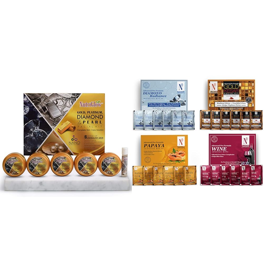 HomeBeautyFace CareFacial KitsNutriGlowPlatinum Diamond Gold and Pearl Facial kit 6-Pieces Skin Care Kit NATURAL'S Advanced Pro Formula Cleanup Kit All Type of Skin Solution for men & women 60 gm (Pack of 4)