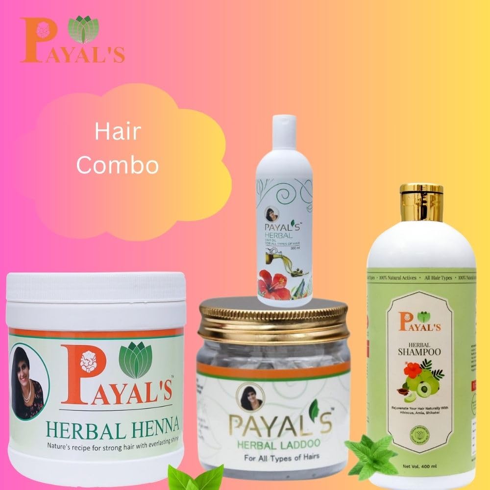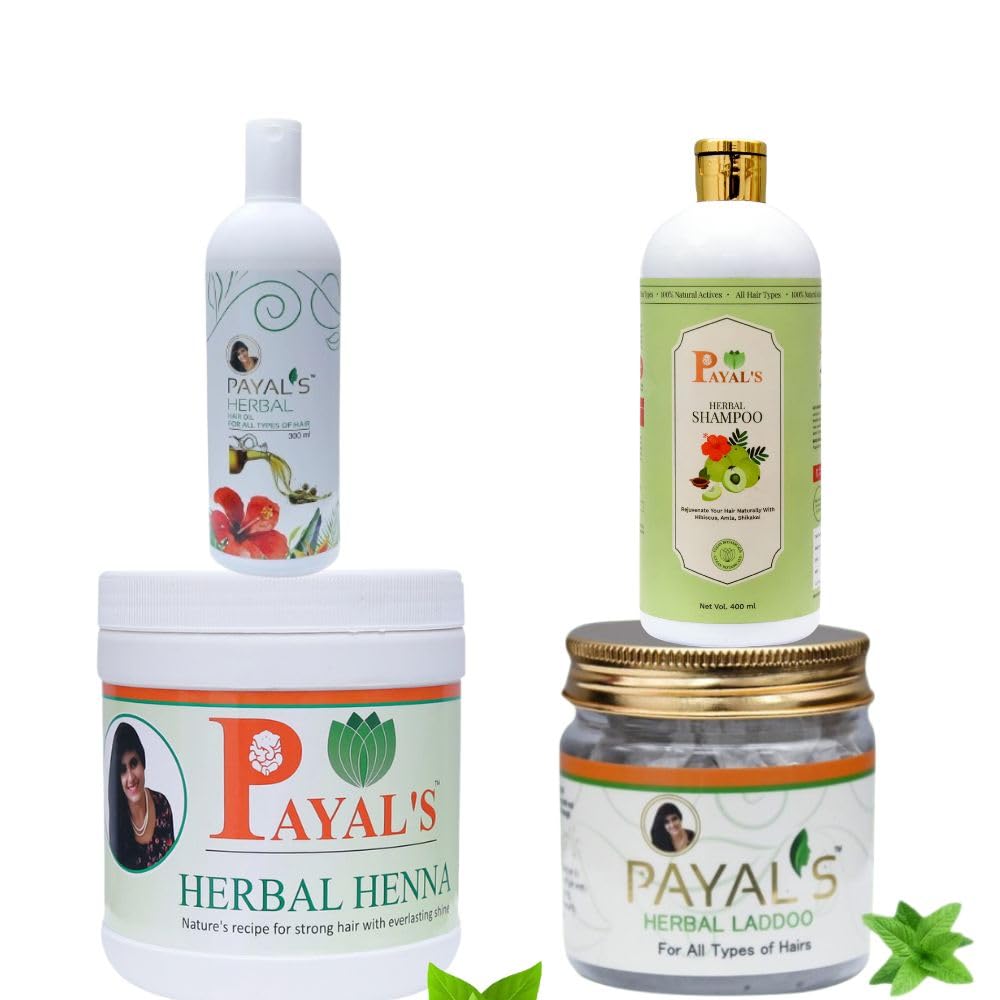 Transform your hair care routine with Payal's comprehensive Natural Hair Care Combo Pack. This complete hair care solution includes four essential products: Herbal Henna for natural conditioning and colour Herbal Oil for nourishment Herbal Laddoo for internal hair health and Herbal Shampoo suitable for all hair types. The Herbal Henna offers a natural way to strengthen your hair while adding shine while the specially formulated Herbal Oil helps in maintaining scalp health. The innovative Herbal Laddoo provides nutritional support for hair wellness from within and the gentle Herbal Shampoo cleanses without stripping natural oils. This versatile combo pack is suitable for all hair types and textures making it an ideal choice for anyone seeking a natural hair care regimen. The products work in harmony to address various hair care needs from cleansing to nourishing. Experience the goodness of traditional herbal ingredients combined with modern hair care science. For best results use these products as part of your regular hair care routine.