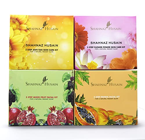 Shahnaz Husain 5 Step Anti-Tan Skin Care Facial Kit (50 g) Shahnaz Husain's Anti Tan Mini Kit comprising of vitamin-rich fruit extracts is specially designed to revitalize and nourish the skin imparting a healthy youthful radiance. Professional Power Bio Hydrating Cleanser : A powerful natural cleanser for the easy and efficient removal of impurities without disturbing the moisture balance SHAHNAZ HUSAIN 5 STEP MIXED FRUIT FACIAL KIT - 50GM Shahnaz Husain's fruit mini kit comprising of vitamin-rich fruit extracts is specially designed to revitalize and nourish the skin imparting a healthy youthful radiance. Cleanse face with professional power bio hydrating cleanser. Apply and wipe with moist cotton wool. Apply exfoliating scrub and rub gently with small circular movements. Wash off. Apply fruit nourishing cream on face and neck and massage for 15 minutes with a little water. Shahnaz Husain 5 Step Papaya Facial Kit â 50 Gm Shahnaz Husainâs Papaya Mini Kit comprises of products for an entire skin care routine. They contain combinations of plant extracts known for their beauty enhancing properties. Professional Power Bio Hydrating Cleanser: A powerful natural cleanser for the easy and efficient removal of impurities without disturbing the moisture balance. Prepares the skin for facial massage and treatments Exfoliating Scrub: A powerful deep cleansing treatment removing dead cells and making the skin appear clear smooth and free from blemishes. Shahnaz Husainâs 5 step Flower Power skin care Kit Shahnaz Husain's Flower Power Kit comprises of products for an entire skin care routine. They contain combinations of plant extracts known for their beauty enhancing properties. Professional Power Bio Hydrating Cleanser: A powerful natural cleanser for the easy and efficient removal of impurities without disturbing the moisture balance. Prepares the skin for facial massage and treatments Exfoliating Scrub: A powerful deep cleansing treatment removing dead cells a