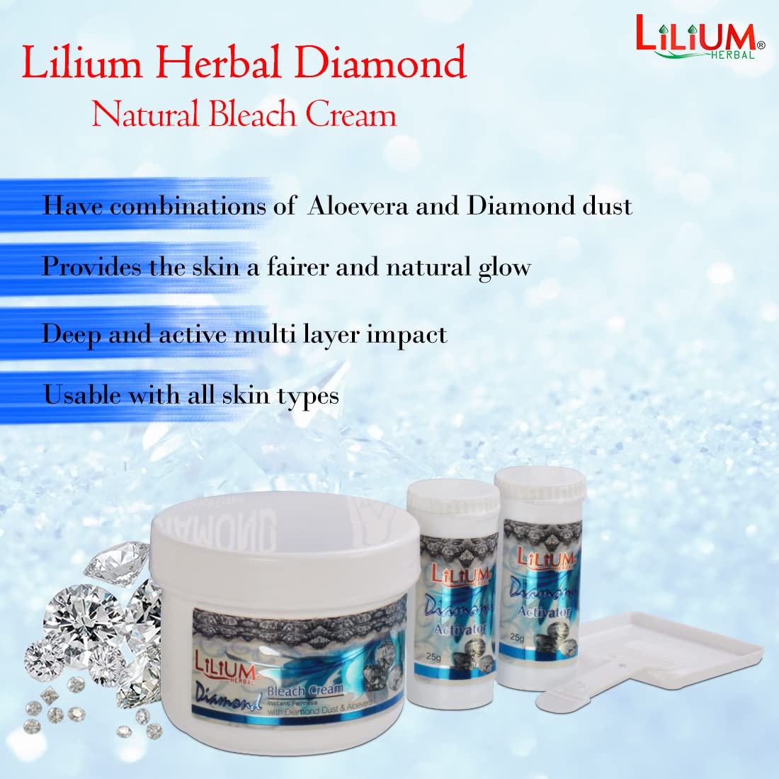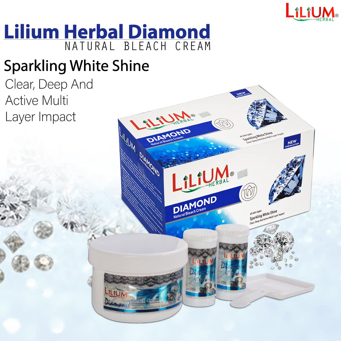 Lilium Diamond Instant Fairness Bleach Cream (300g) enhances your skin’s natural glow by lightening dark spots and unwanted facial hair while providing an instant brightening effect. Infused with diamond dust it gently exfoliates evens out skin tone and leaves your skin radiant soft and refreshed. Suitable for all skin types this bleach cream ensures a salon-like fairness in minutes.