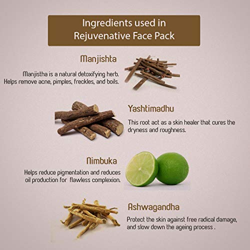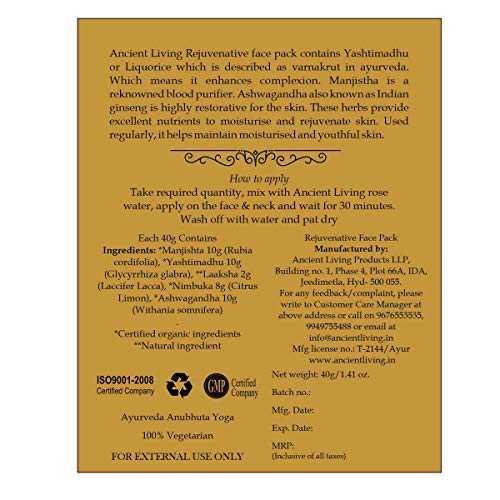 • Ancient Living Rejuvenative face pack contains Yashtimadhu which is described as varnakrut a herb which enhances the complexion. Manjistha is a renowned purifier.