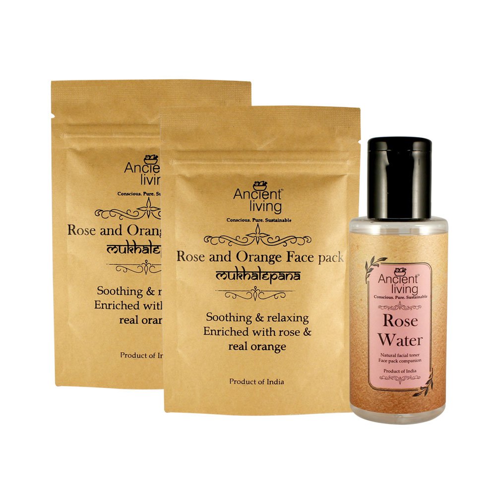 Ancient Living Organic Skin Soothing & Refreshing Pack - Promotes Radiant skin (Rose & Orange Face Pack Pouch 2 & Rose Water 100 Ml)