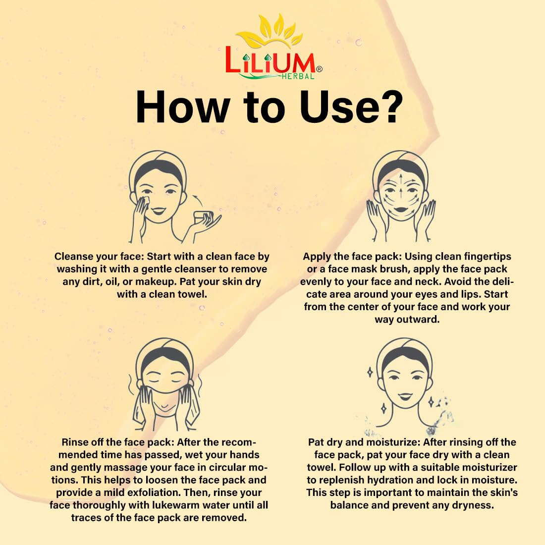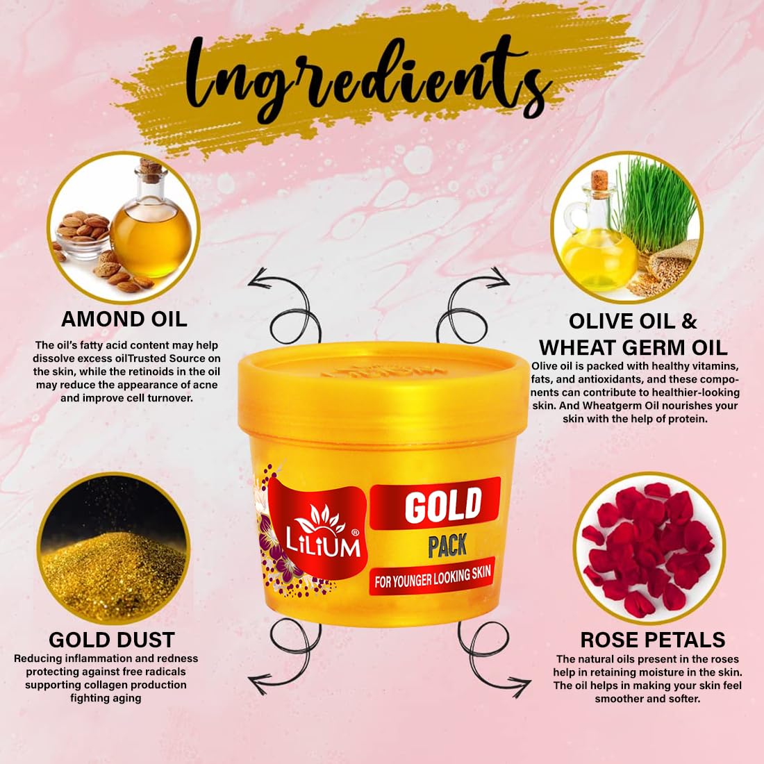 Good choice India provides new brand products. Description: Lilium Gold Face Pack is an exclusive facial pack which helps to accelerate the regeneration of new cells improves skin elasticity rejuvenates the skin and slows visible signs of ageing reduces the appearance of lines and wrinkles giving skin a clear matte look. It also helps to bring glow and visible radiance to the skin. Ingredients: Gold Dust Jojoba & Almond Oil Wheat germ Kaolin Vitamin E Content 100 ml