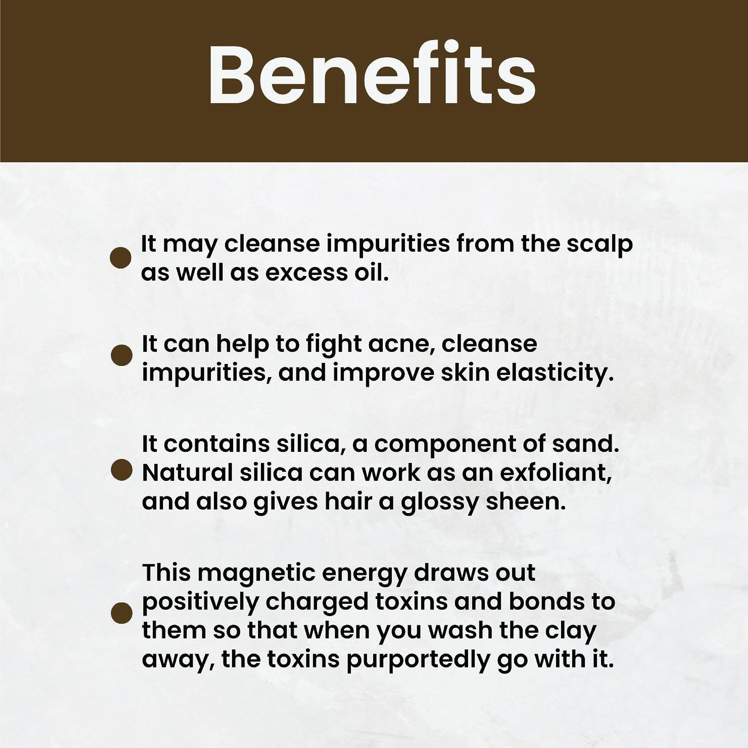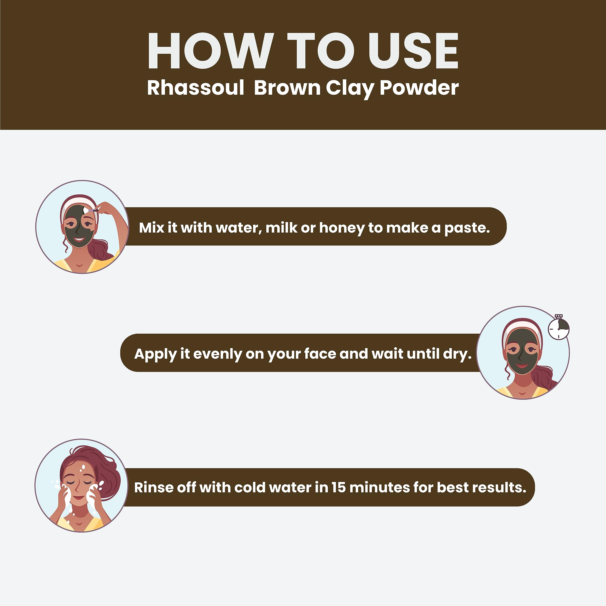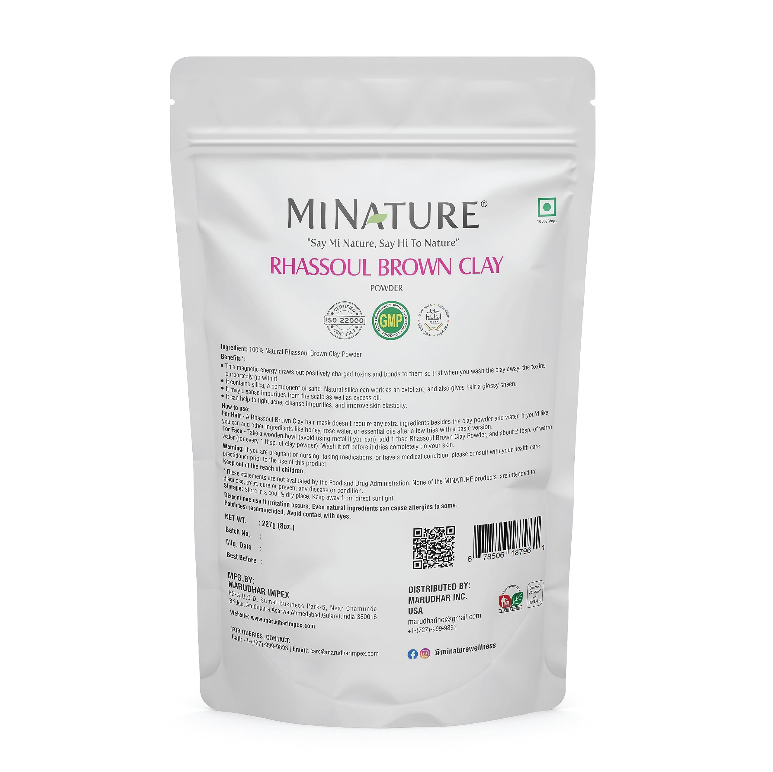 mi nature Rhassoul Brown Clay is a type of stevensite a magnesium-rich clay that contains other minerals. Rhassoul clay is rich in magnesium and potassium. Rhassoul clay lessens dryness enhances skin clarity and elasticity and removes surface oil and oils from inside and around clogged hair follicles that remove impurities and unblock pores. The clay is rich in kaolinite illite montmorillonitea and calcite and is best suited for normal to oily skin types. Benefits: Rhassoul red clay cleanses detoxifies and exfoliates the skin leaving it refreshed toned and rejuvenated.