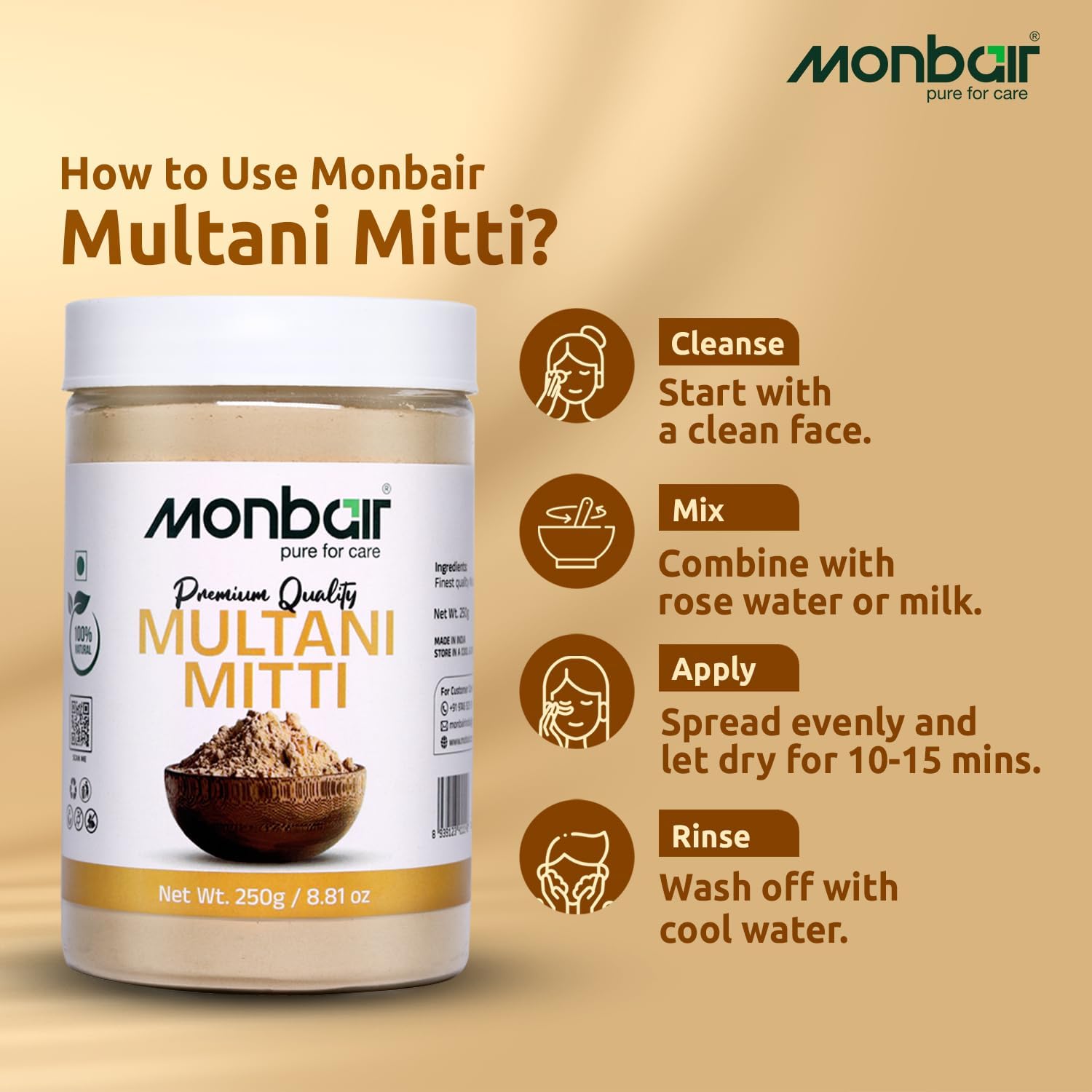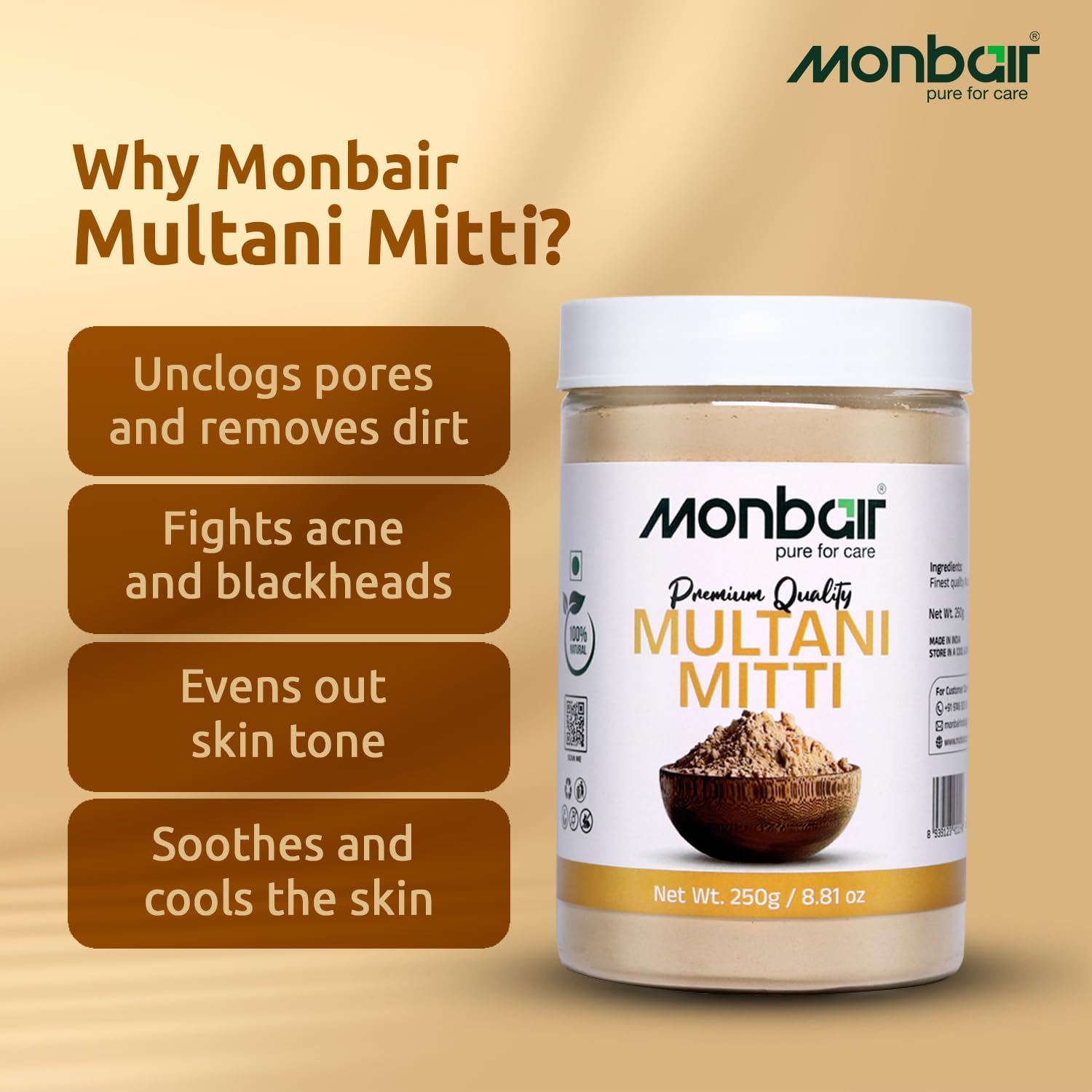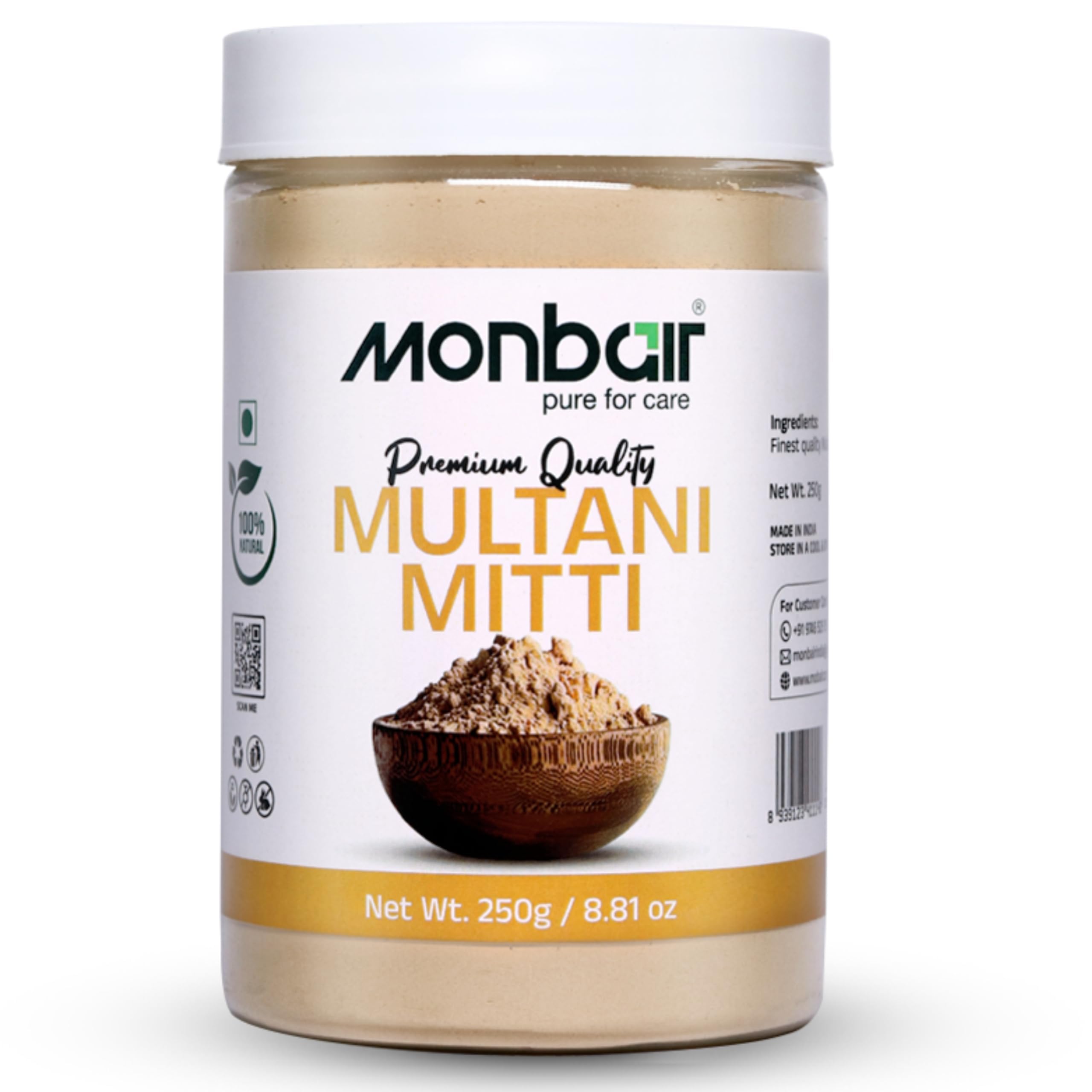 Indulge in the luxurious care of Monbair Multani Mitti Face Pack a natural and chemical-free skincare essential. Whether you want to reduce acne control oil or achieve an even complexion Monbair Multani Mitti is your go-to solution for flawless skin and healthy hair.Benefits Natural & Pure Multani Mitti: Experience the goodness of premium Fuller's Earth clay packed with skin-revitalizing and deep-cleansing properties.Deep Cleansing & Detoxifying: Removes dirt excess oil and toxins leaving your skin smooth fresh and purified.Perfect for All Skin Types: Gentle yet effective for oily dry combination and sensitive skin balancing moisture and controlling excess oil.Multi-Purpose Skincare & Haircare: Ideal for face masks body treatments and hair care to cleanse and nourish from head to toe.Key Benefits:Unclogs Pores & Controls Oil: Absorbs excess sebum preventing acne blackheads and breakouts.Brightens & Evens Skin Tone: Reduces dark spots blemishes and pigmentation for a naturally radiant look.Boosts Blood Circulation: Enhances skin cell regeneration and collagen production for firmer younger-looking skin.Effective for Hair Care: Cleanses the scalp removes dandruff and strengthens hair roots for healthier shinier hair.Why Choose Monbair Multani Mitti? Natural & Chemical-Free: Free from additives preservatives and harmful chemicals.Premium Quality & Finely Sourced: Handpicked for purity and effectiveness.Trusted Ayurvedic Beauty Secret: Used for centuries to detoxify and nourish skin.Easy to Use & Versatile: Mix with rose water yogurt or aloe vera for personalized skincare treatments.