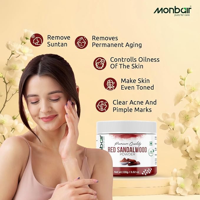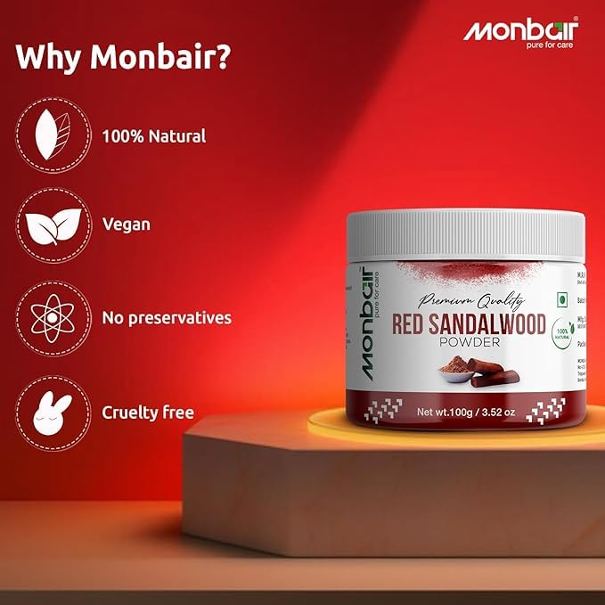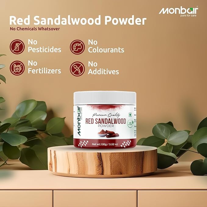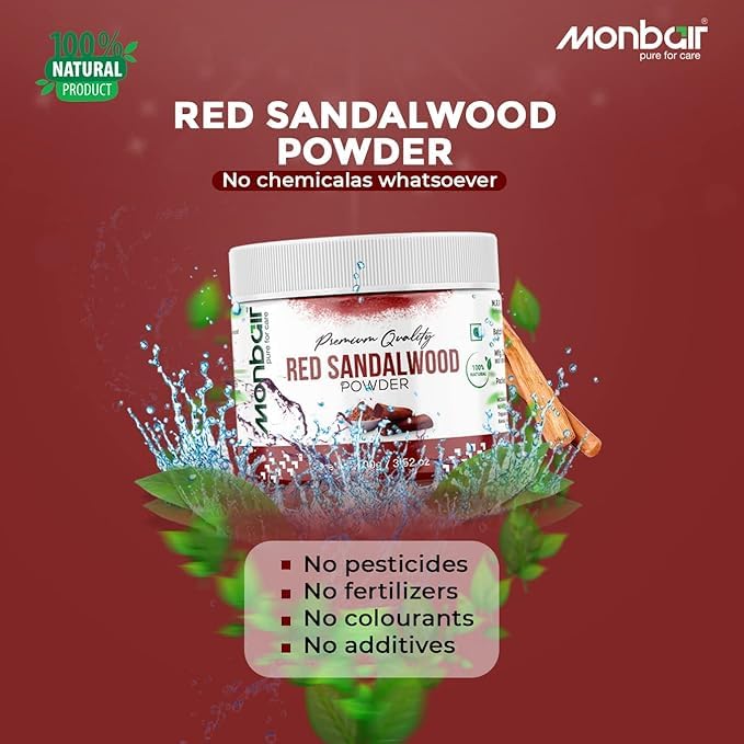 HomeBeautyFace CareMasksFace PacksMONBAIR Red Sandalwood Facepack Powder for Men & Women - 100 grams | 100% Pure Natural No Chemical | Laal Raktha Chandan for Healthy Glowing Skin & De-Tan | For Puja Skin & Face Care