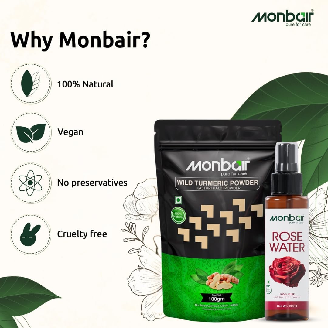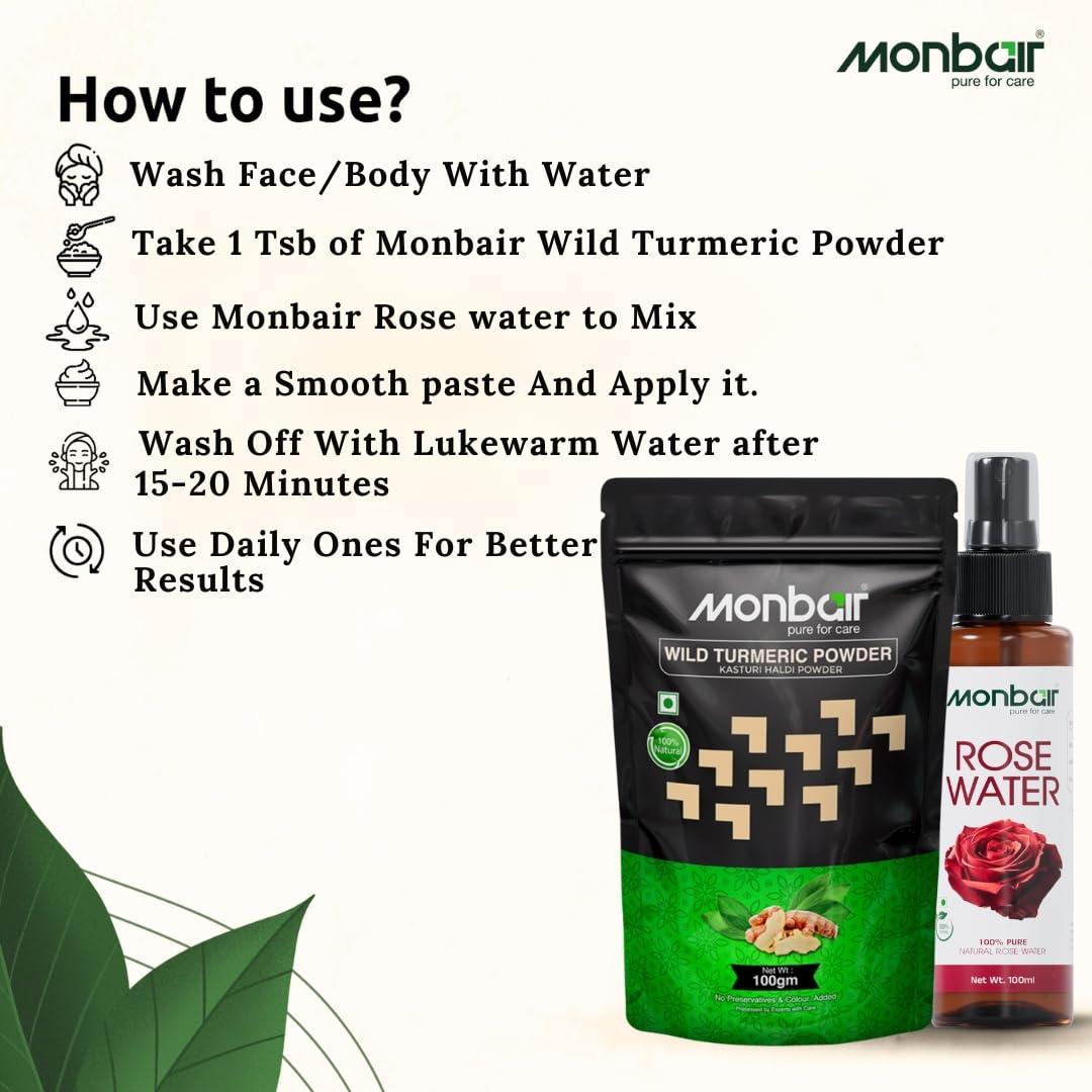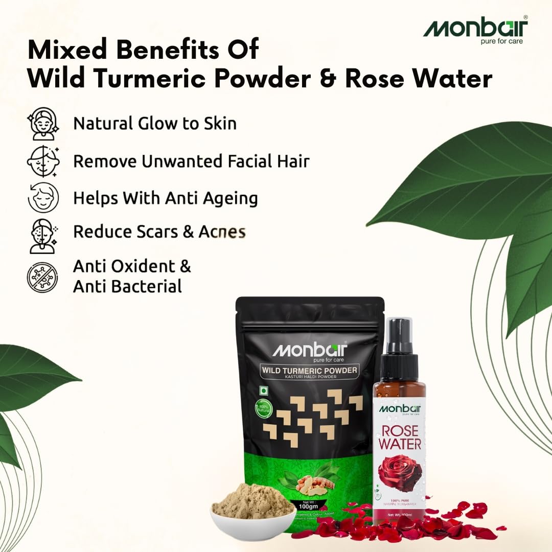 Monbair Wild Turmeric Powder 100g and Rose Water 100ml Combo for Natural Skin Care - Glowing & Radiant Skin