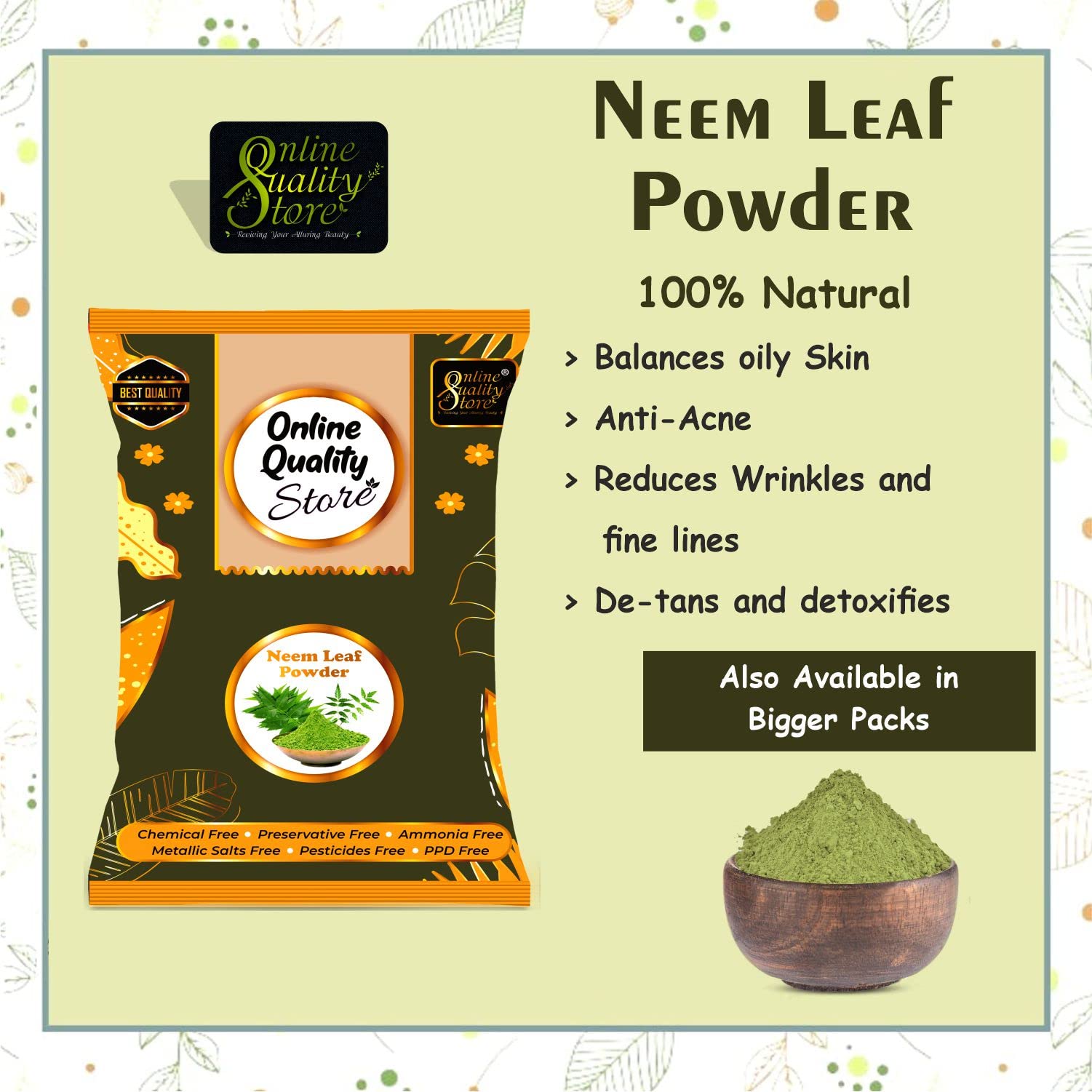 Fine powder of wild Neem Leaves (Indian Lilac). It also helps in treating other skin issues like blackheads pigmentation dullness and pre mature ageing.