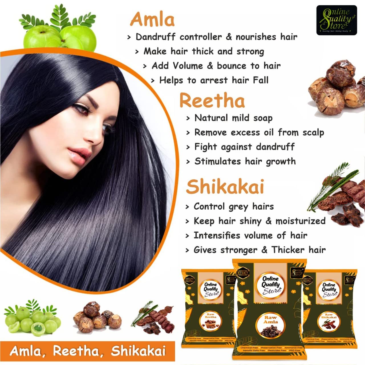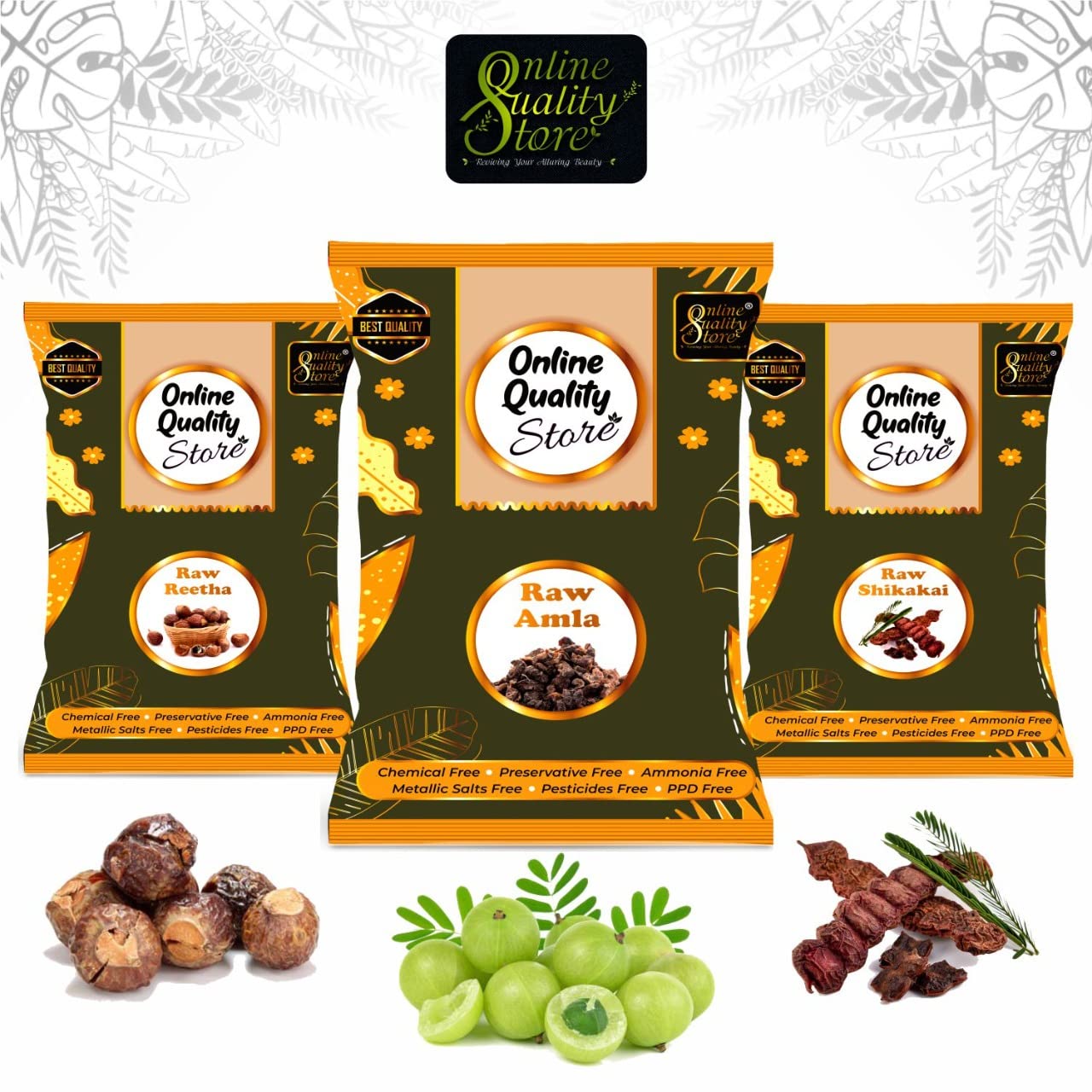 Online Quality Store reetha amla shikakai combo raw form - 600g |Aritha|Soapnuts (Sapindus Mukorossi) |Indian Gooseberry |dried Shikakai Acacia Concinna Total 600g Pack