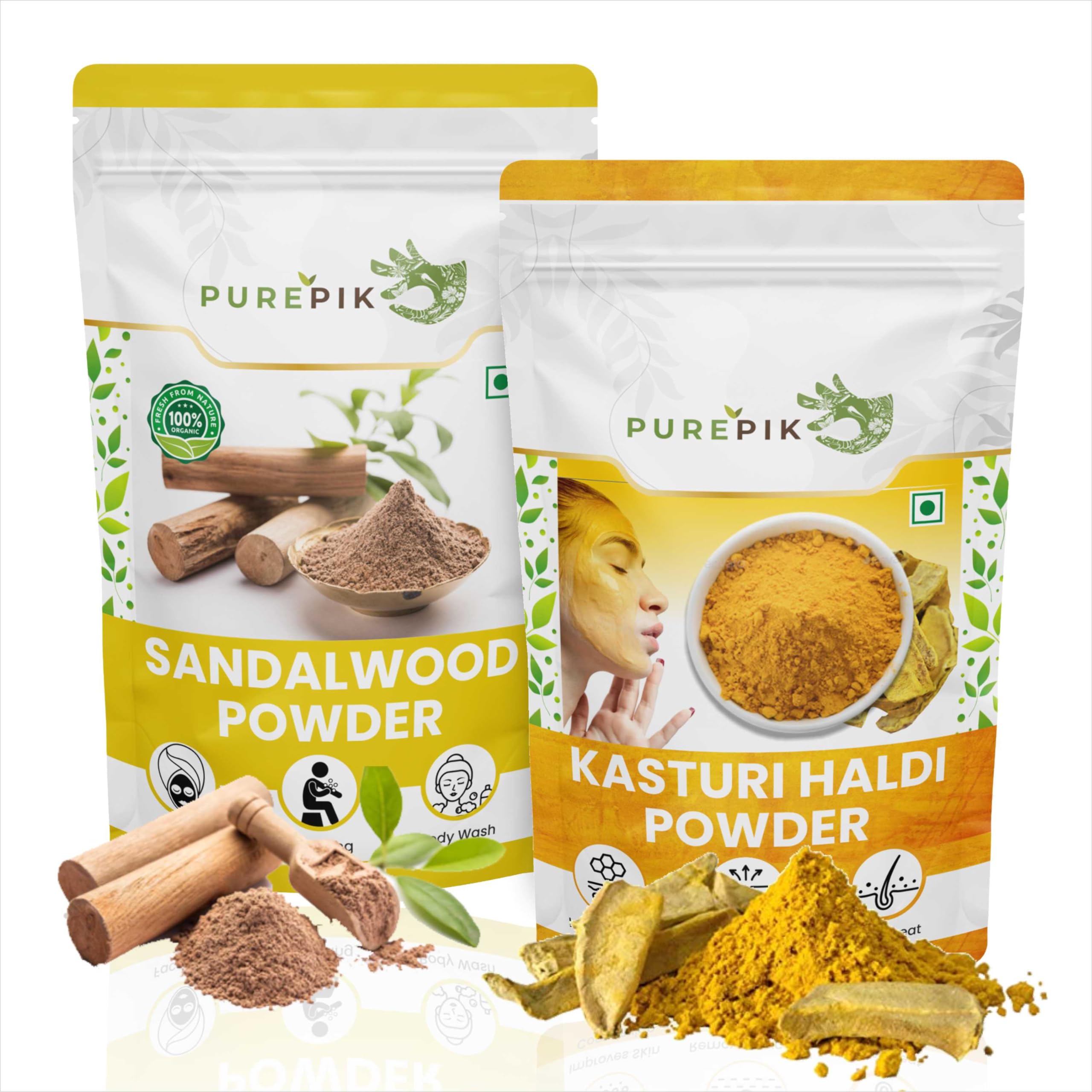 Pure Pik Sandalwood Powder for face pack 100g + Kasturi Haldi Powder for face beauty 100 gram each | Chandan Powder Wild turmeric powderkasturi manjal | Toatl 200 gram Value pack
