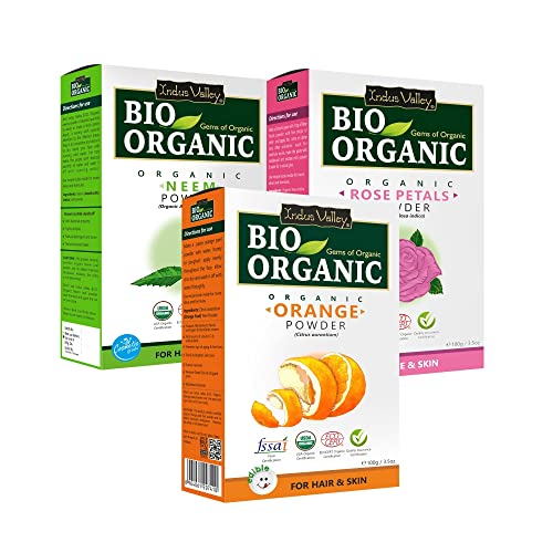 Indus Vallley brings combo of Indus Valley BIO Organic Rose Petals Orange peel Powder & Neem Natural Powder Triple Pack Kit For Skin Care. INDUS VALLEY ROSE PETAL POWDER from the Indus Valley bio organic family is unique solution for both your face as well as hair. Due to its multipurpose effects and its natural key ingredient as rose petals it is considered to be a remarkable solution for hair and face treatment issues. Neem is one of the most common elements used in traditional Ayurvedic remedies. INDUS VALLEY BIO ORGANIC NEEM POWDER is prepared to meet the needs of both the face and hair. With Neem as its key element it is completely organic in nature without any traces of chemicals. This Neem powder for hair is rich in elements that can lessen the hair fall and arouse hair build up. Neem can also take away the excessive greasiness from the scalp and keeps it hydrated. Hence the hair will not weigh down and they look voluminous. The regenerative properties of neem slow down the ageing process and keeps all skin issues such as acne breakouts open pores pimples wrinkles fine lines dull skin at bay. This Neem powder organic face pack acts as good exfoliator for the skin. It helps in the removal of dead skin cells and glorify skin complexion. INDUS VALLEY ORANGE PEEL POWDER is rich in vitamin C that protects skin from free radical damage keeps skin hydrated and moisturized. Brighten your skin tone with the anti-oxidant property of orange peel and maintains the elasticity of skin. It works in the best possible ways to keep you glowing and healthy. It gives off a rejuvenating face and skin when added to water or other essential oil and ingredients.