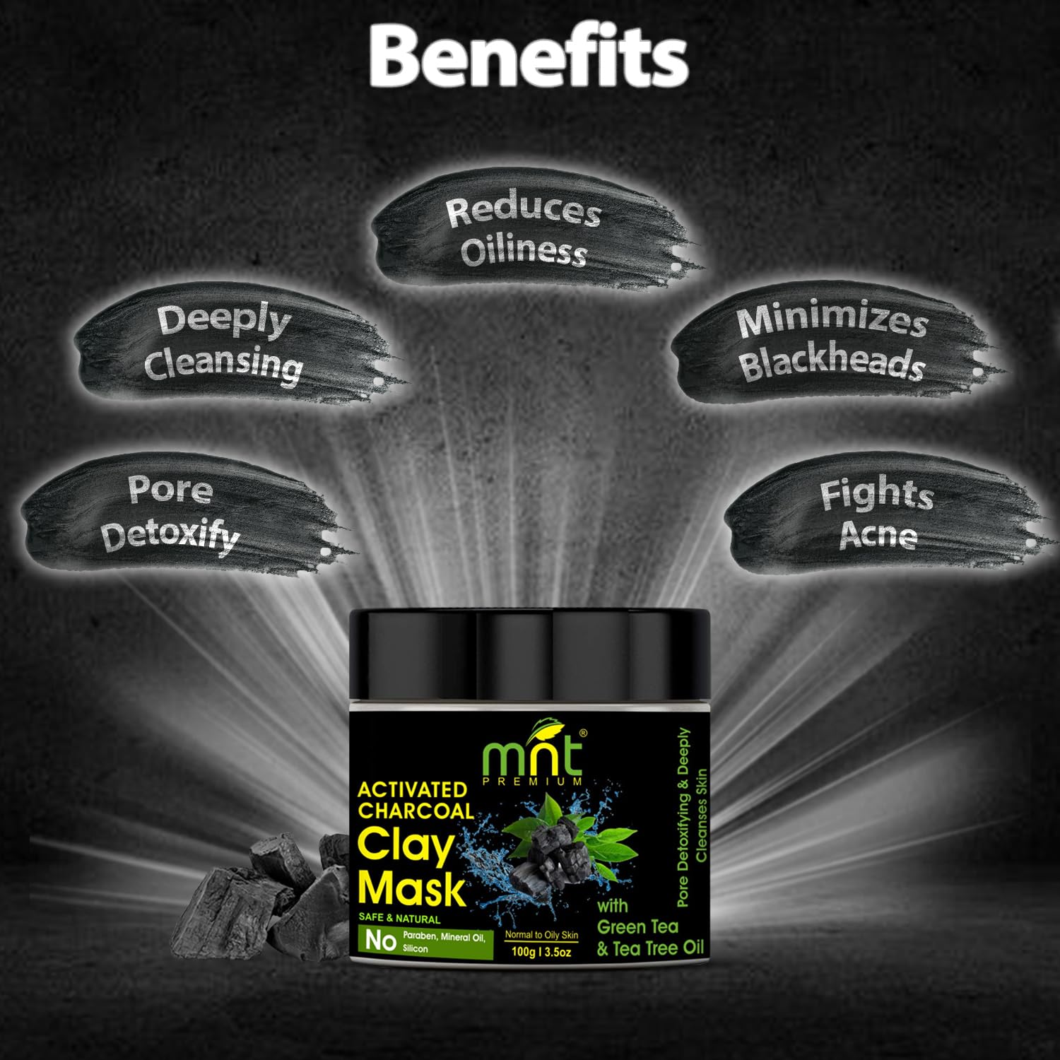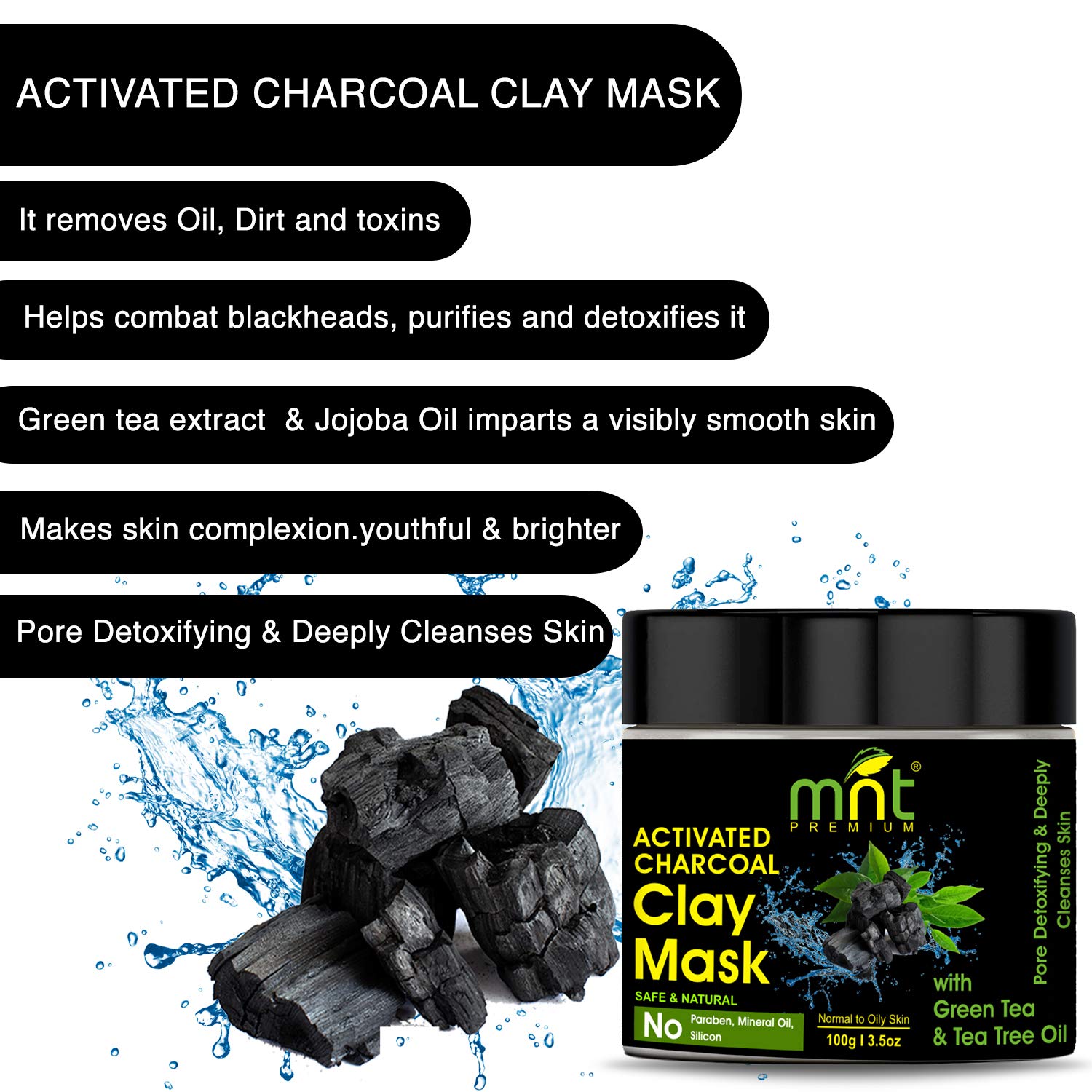 MNT activated charcoal clay mask gently removes oil dirt and toxins. Helps combat blackheads purifies and detoxifies skin. Green tea extract & jojoba oil imparts a visibly smooth and youthful brighter complexion.