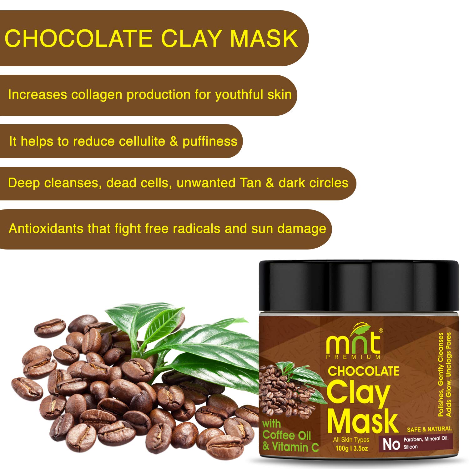 MNT chocolate clay face mask deep cleanses dead cells unwanted tan dark circles increases collagen production for youthful skin and helps reduce cellulite & puffiness. Antioxidants that fight free radicals and sun damage.