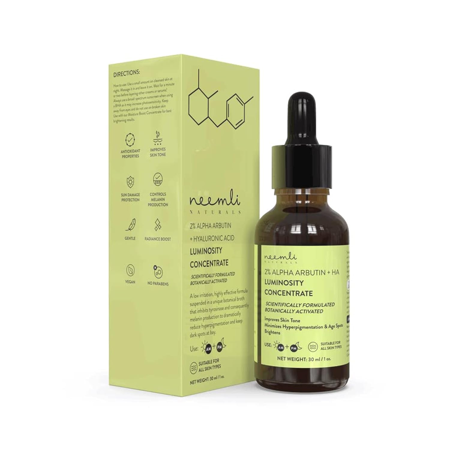 • Package Contents: 1 Bottle of 2% Alpha Arbutin + Hyaluronic Acid Luminosity Concentrate Serum 30 ml; Neemli Naturals products are formulated without synthetic ingredients parabens sodium lauryl sulfate phthalates chemicals fillers mineral oils petroleum a