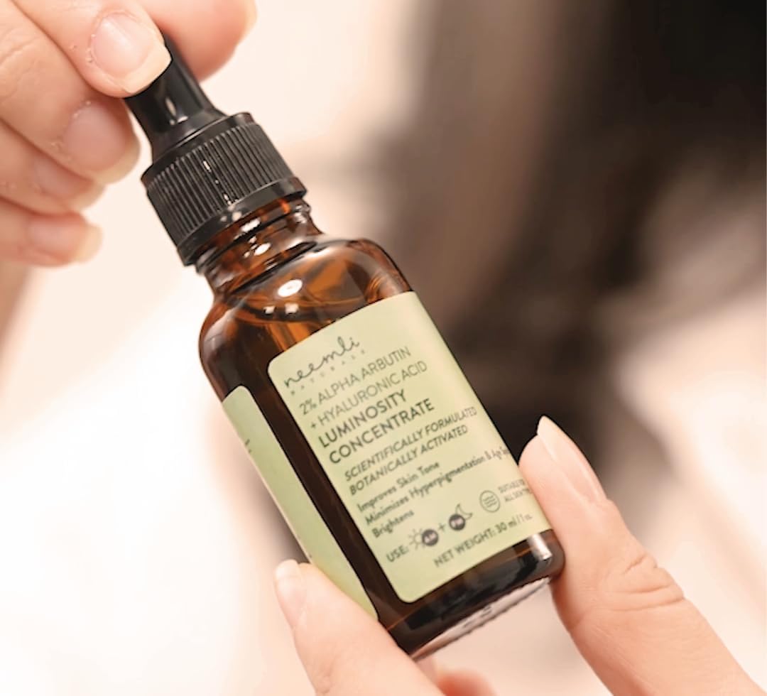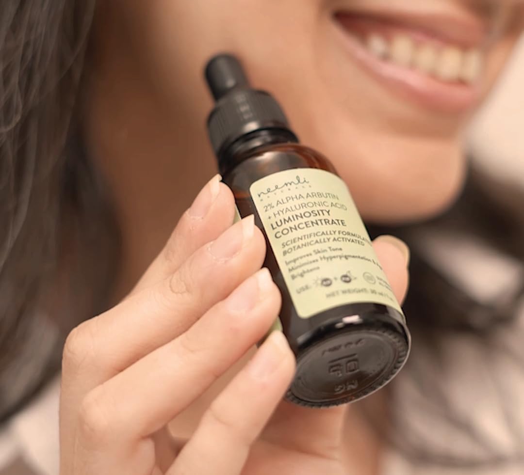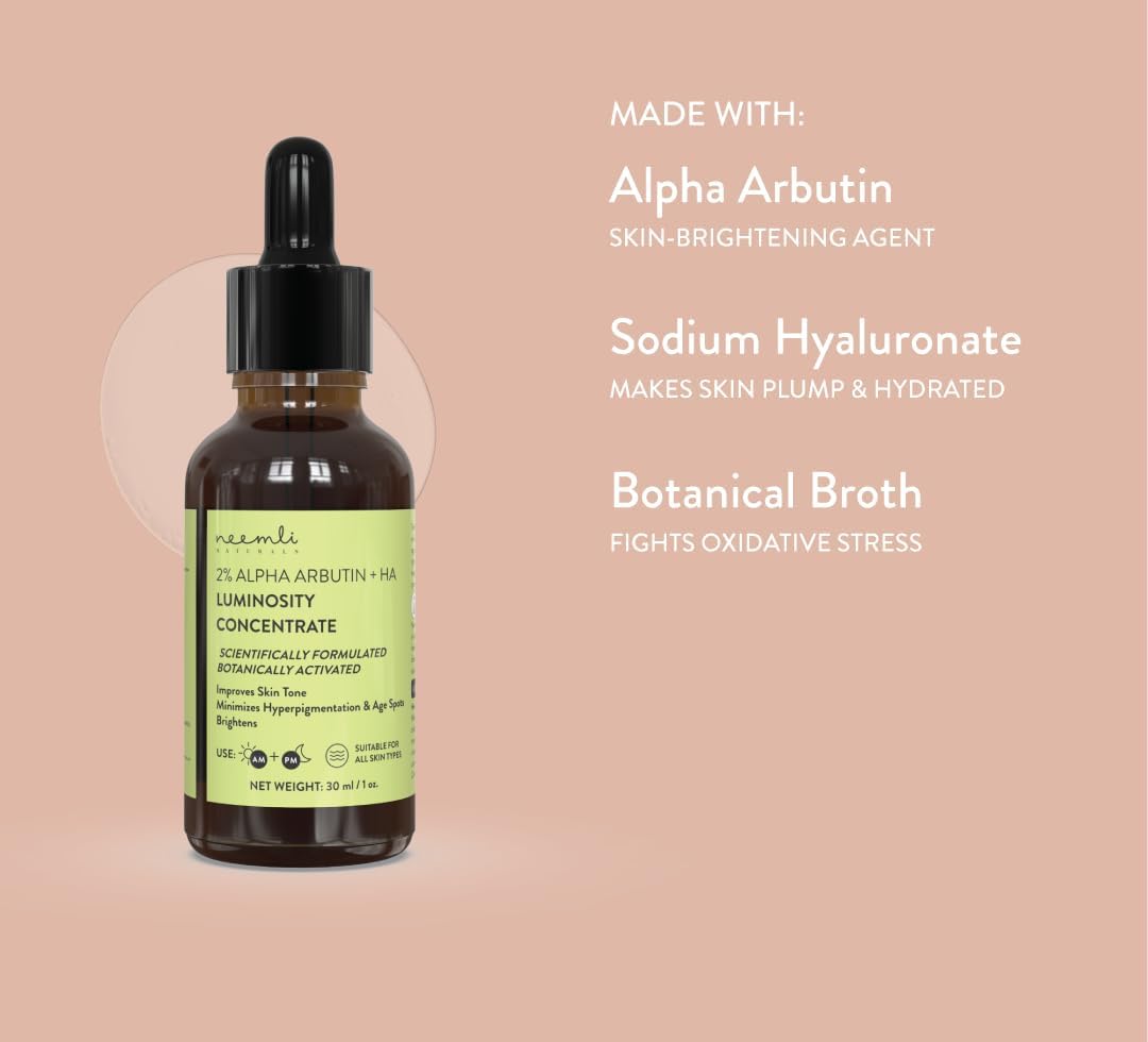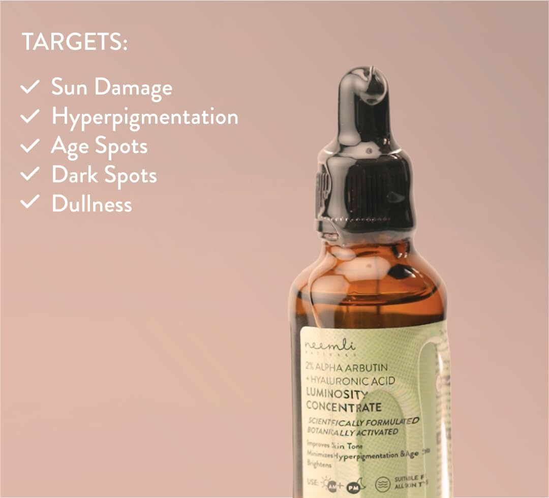 2% Alpha Arbutin + Hyaluronic Acid Luminosity Concentrate by Neemli Naturals | Serum, Improves Skin Tone, Sun Damage Protection, Minimizes Hyperpigmentation & Age Spots 30 ml