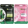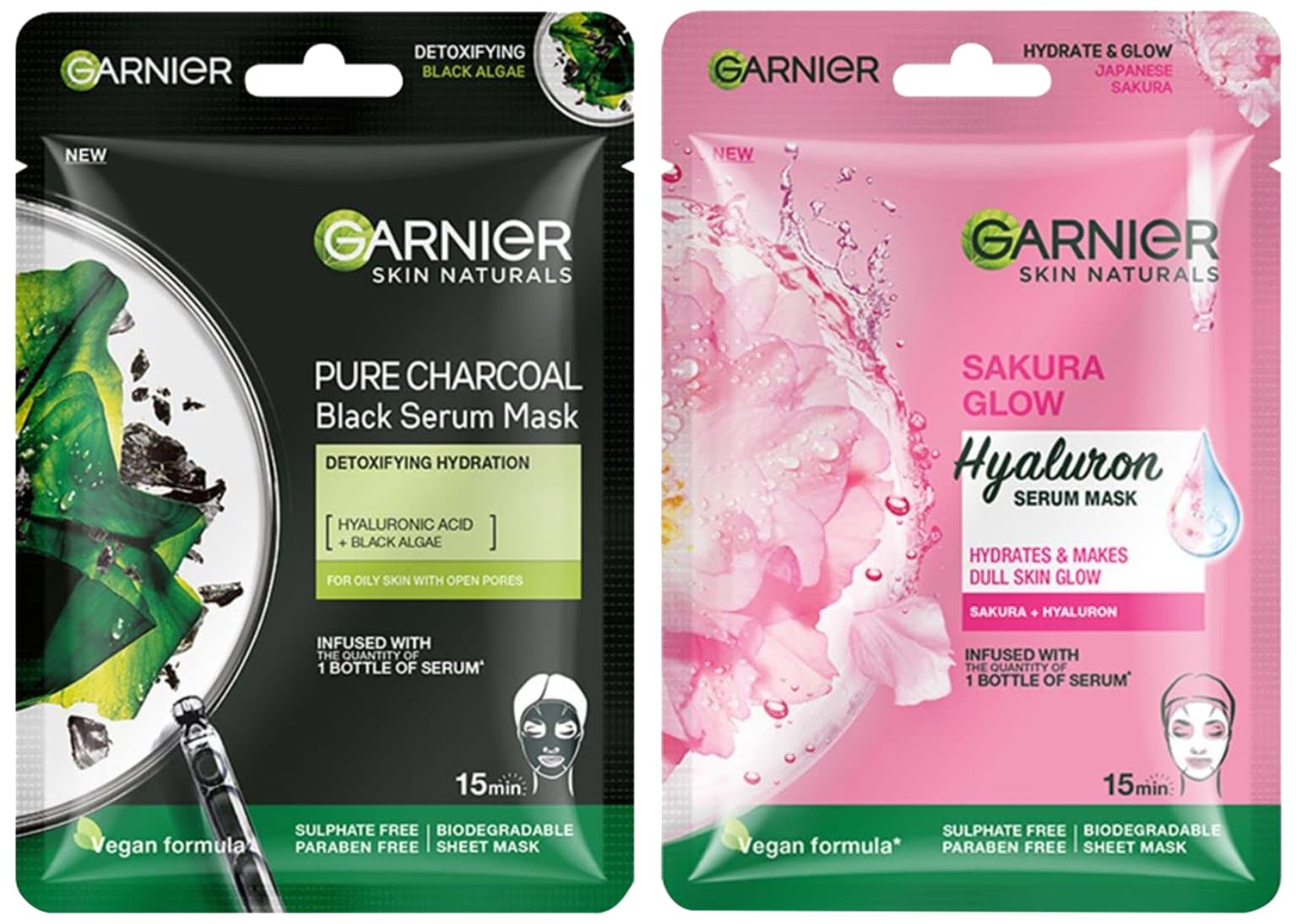 Garnier Skin Naturals Charcoal Face Serum Sheet Mask (Black) 28gGarnier introduces a new generation of face masks for women that infuses skin with 1 week of serum with 1 mask. Garnier black serum mask is a breakthrough black tissue mask technology that offers double purifying and hydrating efficacy. Use Garnier black serum mask if you have dull skin with clogged and enlarged pores. It is enriched with charcoal known for its ability to remove impurities. It is also enriched with pore tightening black algae extracts. The serum mask will intensely hydrate and purify your skin while also tightening its pores. The sheet mask has been dermatologically tested.Garnier Skin Naturals Sakura White Face Serum Sheet Mask (Pink) 32gGarnier introduces a new generation of face masks for women that infuses skin with 1 week of serum with 1 mask. Use Garnier Sakura White Sheet Mask if you have dull and de-hydrated skin. It is enriched with Japanese Sakura and will instantly hydrate giving it a pinkish glow in just 15 mins. It will also smoothen your skin. The tissue mask has been dermatologically tested. How to use â Unfold the mask. Apply on clean face with blue protective film facing outwards. Remove the blue film. Adjust the mask to the contours of your face. Leave it on for 15mins. Remove mask and gently massage your face with the excess serum.