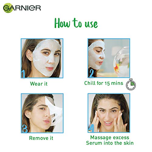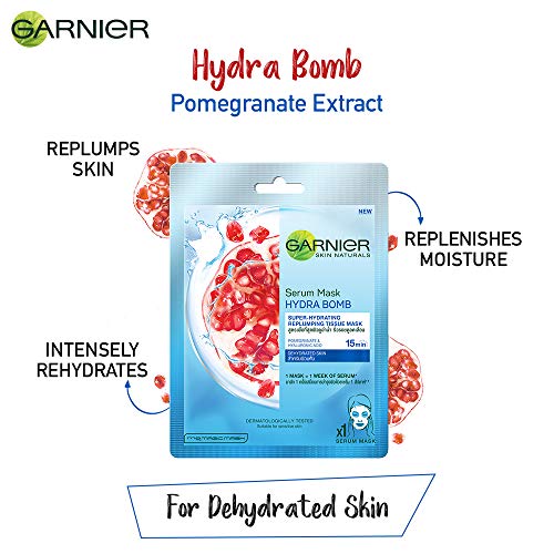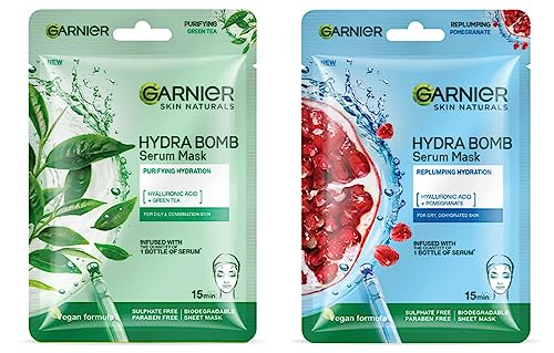 Garnier Skin Naturals Hydra Bomb Face Serum Sheet Mask (Blue) 32gGarnier introduces a new generation of face masks for women that infuses skin with 1 week of serum with 1 mask. Use Garnier Hydra Bomb Sheet Mask if you have dry and de-hydrated skin. It is enriched with anti-oxidant Pomegranate extracts and will intensely hydrate your skin and replenish its lost moisture just 15 mins. The tissue mask has been dermatologically tested. How to use â Unfold the mask. Apply on clean face with blue protective film facing outwards. Remove the blue film. Adjust the mask to the contours of your face. Leave it on for 15mins. Remove mask and gently massage your face with the excess serum.Garnier Skin Naturals Green Tea Face Serum Sheet Mask (Green) 32gGarnier introduces a new generation of face masks for women that infuses skin with 1 week of serum with 1 mask. Use Garnier Hydra Bomb Green Tea Sheet Mask if you have oily and dry skin. It is enriched with detoxifying Green Tea extracts and will instantly hydrate and purify your skin in just 15 mins. The mask will also help in mattifying the skin and reducing the pores. The tissue mask has been dermatologically tested. How to use â Unfold the mask. Apply on clean face with blue protective film facing outwards. Remove the blue film. Adjust the mask to the contours of your face. Leave it on for 15mins. Remove mask and gently massage your face with the excess serum