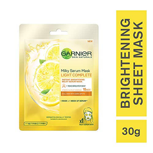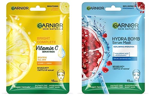 Garnier Skin Naturals Hydra Bomb Face Serum Sheet Mask (Blue) 32gGarnier introduces a new generation of face masks for women that infuses skin with 1 week of serum with 1 mask. Use Garnier Hydra Bomb Sheet Mask if you have dry and de-hydrated skin. It is enriched with anti-oxidant Pomegranate extracts and will intensely hydrate your skin and replenish its lost moisture just 15 mins. The tissue mask has been dermatologically tested. How to use â Unfold the mask. Apply on clean face with blue protective film facing outwards. Remove the blue film. Adjust the mask to the contours of your face. Leave it on for 15mins. Remove mask and gently massage your face with the excess serum.Garnier Skin Naturals Light Complete Face Serum Sheet Mask (Yellow) 32gGarnier introduces a new generation of face masks for women that infuses skin with 1 week of serum with 1 mask. Use Garnier Light Complete Sheet Mask if you have dull de-hydrated skin with spots. It is enriched with Lemon and Vitamin C and will instantly hydrate and brighten your skin in just 15 mins. It will also help in reducing spots The tissue mask has been dermatologically tested. How to use â Unfold the mask. Apply on clean face with blue protective film facing outwards. Remove the blue film. Adjust the mask to the contours of your face. Leave it on for 15mins. Remove mask and gently massage your face with the excess serum.