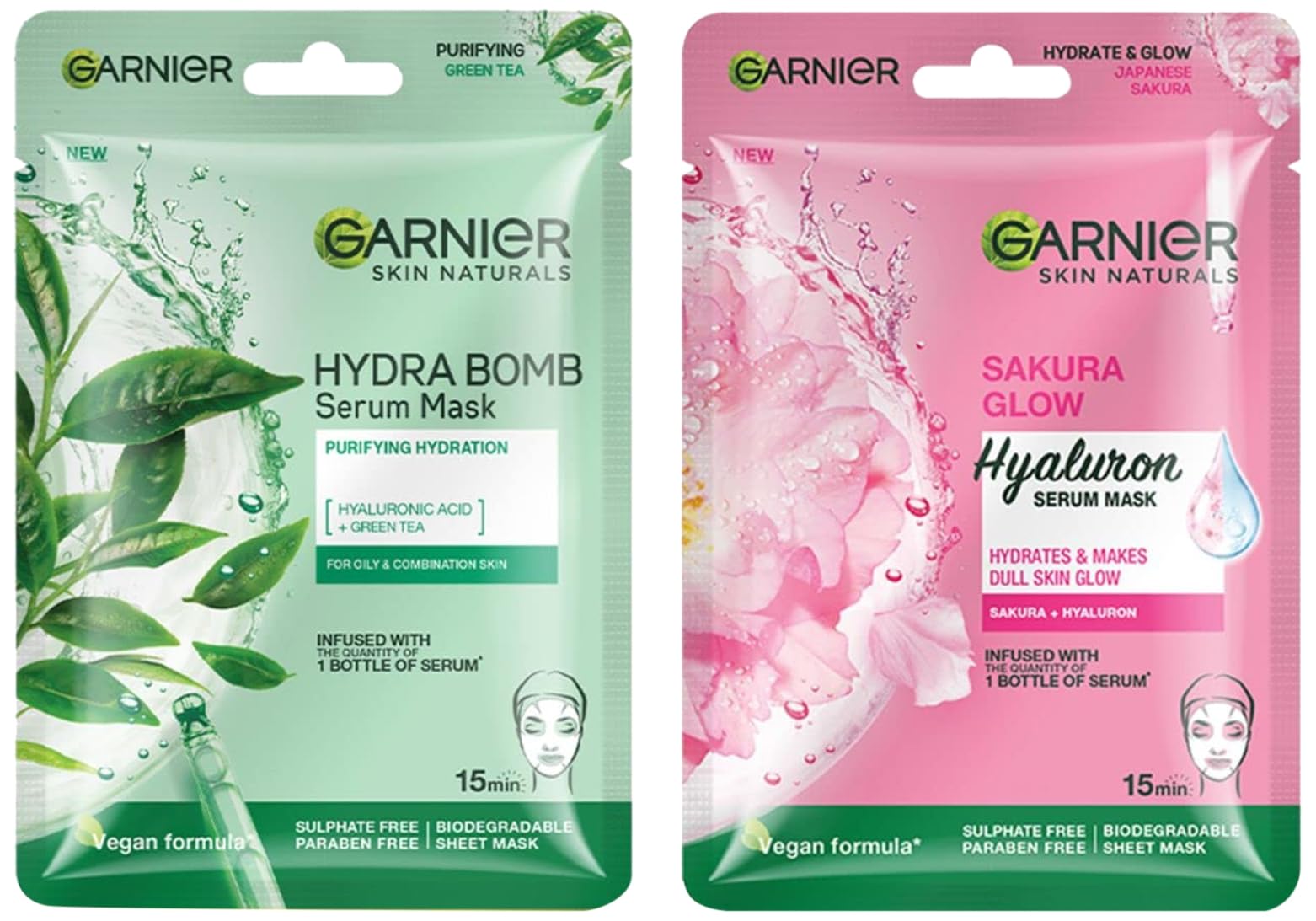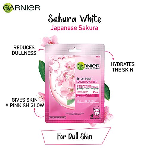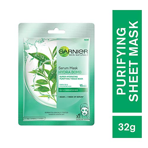 Garnier Skin Naturals Sakura White Face Serum Sheet Mask (Pink) 32gGarnier introduces a new generation of face masks for women that infuses skin with 1 week of serum with 1 mask. Use Garnier Sakura White Sheet Mask if you have dull and de-hydrated skin. It is enriched with Japanese Sakura and will instantly hydrate giving it a pinkish glow in just 15 mins. It will also smoothen your skin. The tissue mask has been dermatologically tested. How to use â Unfold the mask. Apply on clean face with blue protective film facing outwards. Remove the blue film. Adjust the mask to the contours of your face. Leave it on for 15mins. Remove mask and gently massage your face with the excess serum.Garnier Skin Naturals Green Tea Face Serum Sheet Mask (Green) 32gGarnier introduces a new generation of face masks for women that infuses skin with 1 week of serum with 1 mask. Use Garnier Hydra Bomb Green Tea Sheet Mask if you have oily and dry skin. It is enriched with detoxifying Green Tea extracts and will instantly hydrate and purify your skin in just 15 mins. The mask will also help in mattifying the skin and reducing the pores. The tissue mask has been dermatologically tested. How to use â Unfold the mask. Apply on clean face with blue protective film facing outwards. Remove the blue film. Adjust the mask to the contours of your face. Leave it on for 15mins. Remove mask and gently massage your face with the excess serum