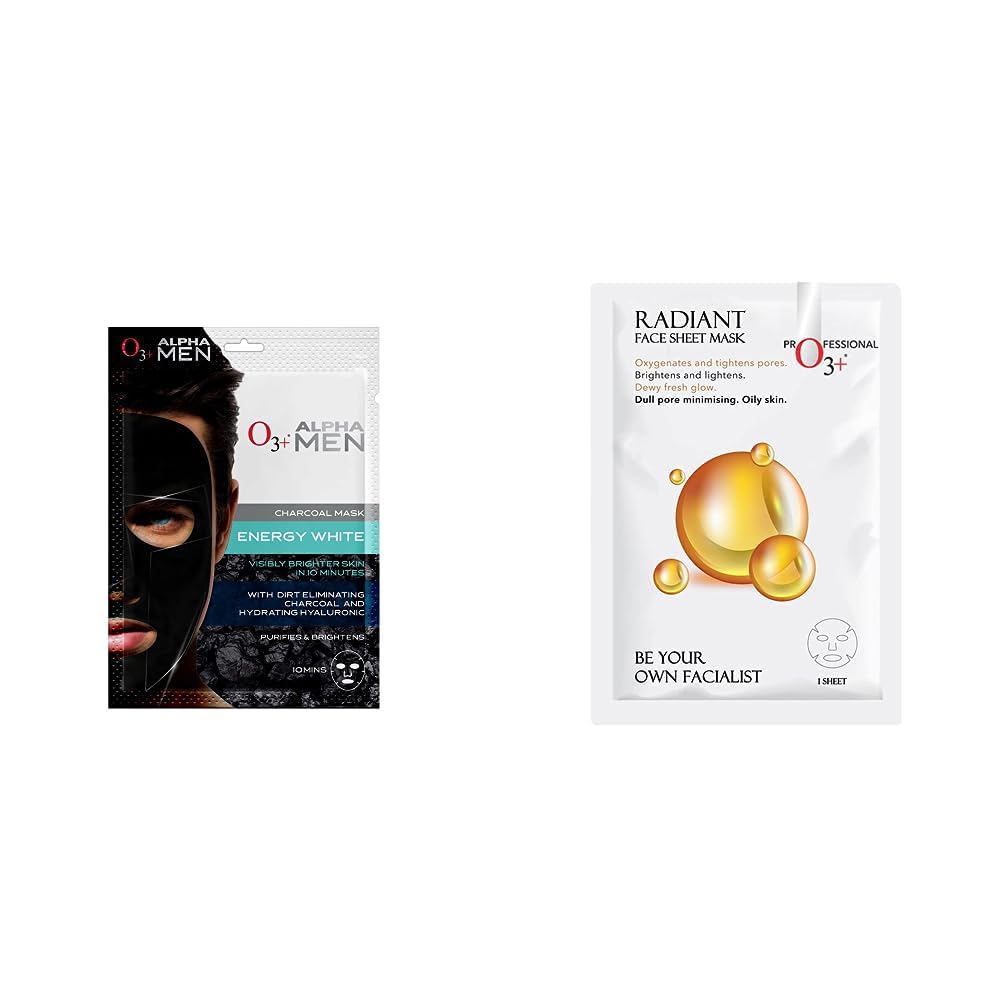 HomeBeautyFace CareMasksSheet MasksO3+ ALPHA MEN Energy White Charcoal Face Sheet Mask 30g with Charcoal & Hydrating Hyaluronic to Purify & Brighten Skin & O3+ Facialist Vitamin C Cellulose sheet Mask (30g) Combo