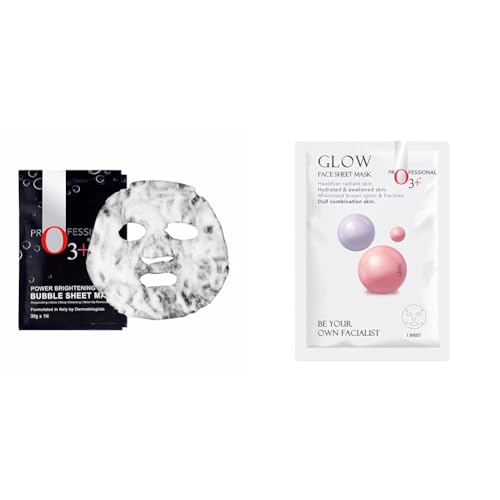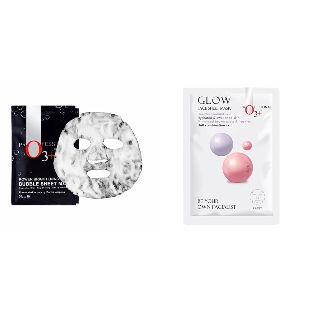 O3+ Power Brightening Bubble Sheet Mask for Deep cleansing and glowing skin (30gm & O3+ Facialist Glow Sheet Mask Hydrates and awakens skin Minimized brown spots and Freckles (30g) Combo