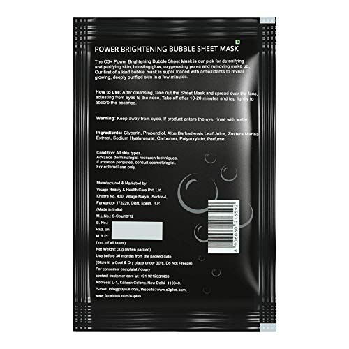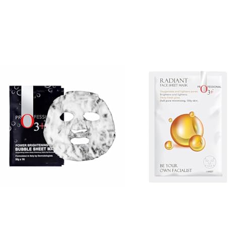 O3+ Power Brightening Bubble Sheet Mask for Deep cleansing and glowing skin (30gm & O3+ Facialist Radiant Face Sheet Mask for Oxygenates and tightens pores to reduce uneven skin tone (30g) Combo