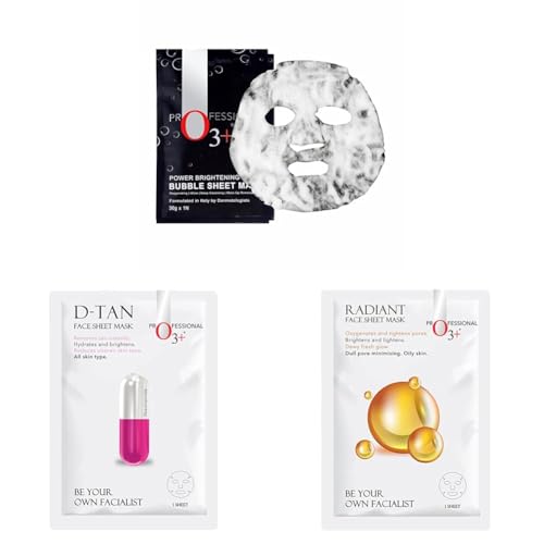 O3+ Power Brightening Bubble Sheet Mask for Deep cleansing and glowing skin & O3+ Facialist Dtan Face Sheet Mask With Niacinamide reduced dark spots, acne scars, and discoloration while giving ultimate brightening & O3+ Facialist Radiant Face Sheet Mask f