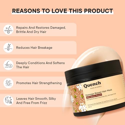 Light creamy texture natural infused ingredients Quinoa Bao bab oil Hydrolised protien blend helps to strenghtens hair and damage repair. Hyaluronic acid helps to give moisturization to scalp and hairs ceramides play a role in repairing damaged hair restoring its natural barrier function. It work on the scalp and hair by thoroughly protecting it from any further damage. Quinoa hair mask gives Hydrating conditioning effects and gives hair strenghtening and intensive damage repair and helps to further hair growth. It gives anti frizz effect.