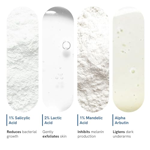 • REDUCES UNDERARM DISCOLORATION: 2% Lactic acid & 1% SA gently exfoliate dead skin cells and help to speed up cell turnover and cell renewal to reveal newer fresher smoother skin. 1% Mandelic acid helps boost collagen production resulting in radiant undera