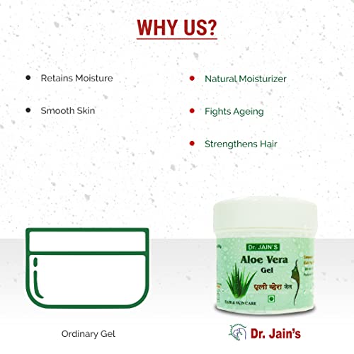 "For Face - Treat Pimples by applying the Aloe Vera Gel to the affected area twice daily. Cleanse the face and apply the Aloe Vera Gel in circular motions all over the face. Rinse off with cool water and gently pat dry to Nourish & Make Skin Softer For Skin - Reduce Hyperpigmentation by applying the gel to pigmented areas before bedtime. Wash your face using warm water the following day. Repeat daily to see visible results Remove Sun Tan by applying the gel evenly on areas affected and leave for 10-15 mins. Wash off with normal water and repeat until effects are visible Apply the Aloe Vera Gel as a Natural Moisturizer or mix it with regular cream and use daily For Hair - Mix a few drops of Castor Oil & Aloe Vera Gel and apply to Boost Hair Growth. Leave for 30 mins and then rinse off. Repeat 2-3 times a week for 3 months to view results Rub the gel or mixture directly on the scalp and leave for an hour. Use mild shampoo to Add Shine To Hair Take half a cup of gel + 2 tbsp of lemon juice. Mix well and apply directly on the scalp to Treat Dandruff. Leave for 30-40 mins and wash with lukewarm water. BENEFITS FOR HAIR - Treats Pimples Makes Skin Softer Nourishes Skin Reduces Hyperpigmentation Removes Skin Tan Natural Moisturizer Boosts Hair Growth Adds Shine To Hair Treats Dandruff DESCRIPTION - Dr. Jain's Herbal Products is one of the well-recognized manufacturers of Herbal Health Skin & Hair Care Ayurvedic Powders Gels & Aromatic Essential Oils. As per the demands a well-researched formulation based on pure herbal and Ayurvedic products. Aloe Vera Gel is a 100% Natural Key to a Smooth Nourished & Moisturized Skin. It is suitable for all skins and helps treat burns and fight skin ageing."