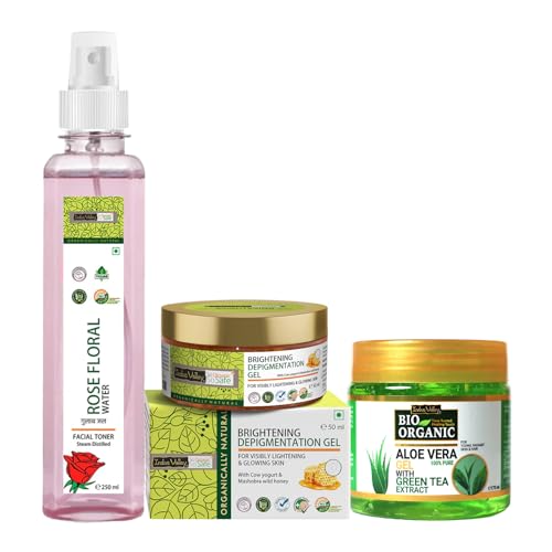 Indus Valley Bio Organic Pure Multipurpose Aloe Vera Gel 175 ml with Green Tea Extract and Depigmentation Gel - 50 ml Natural Cow's Milk Yogurt with Rose Water skin Toner -250 ml Organic Gulab jal