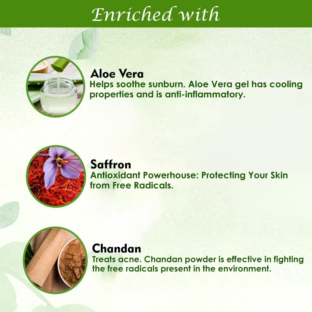 Chandan and Kesar extracts with Aloevera fairness gel works effectively within the inner layers of skin which reduces melanin to give freedom from the sun burns tanning dark spots and pigmentation.