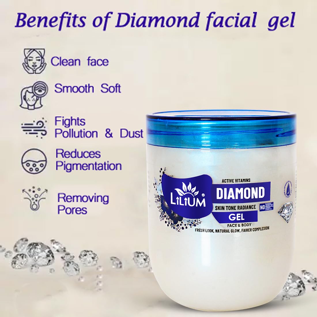 Lilium Diamond Facial Gel 500g Fresh Look Natural Glow Fairer Complexion Skin Tone Radiance Hydrates Skin Reduce Pigmentation Anti-Aging Anti-acne Easy Absorption All Skin Types