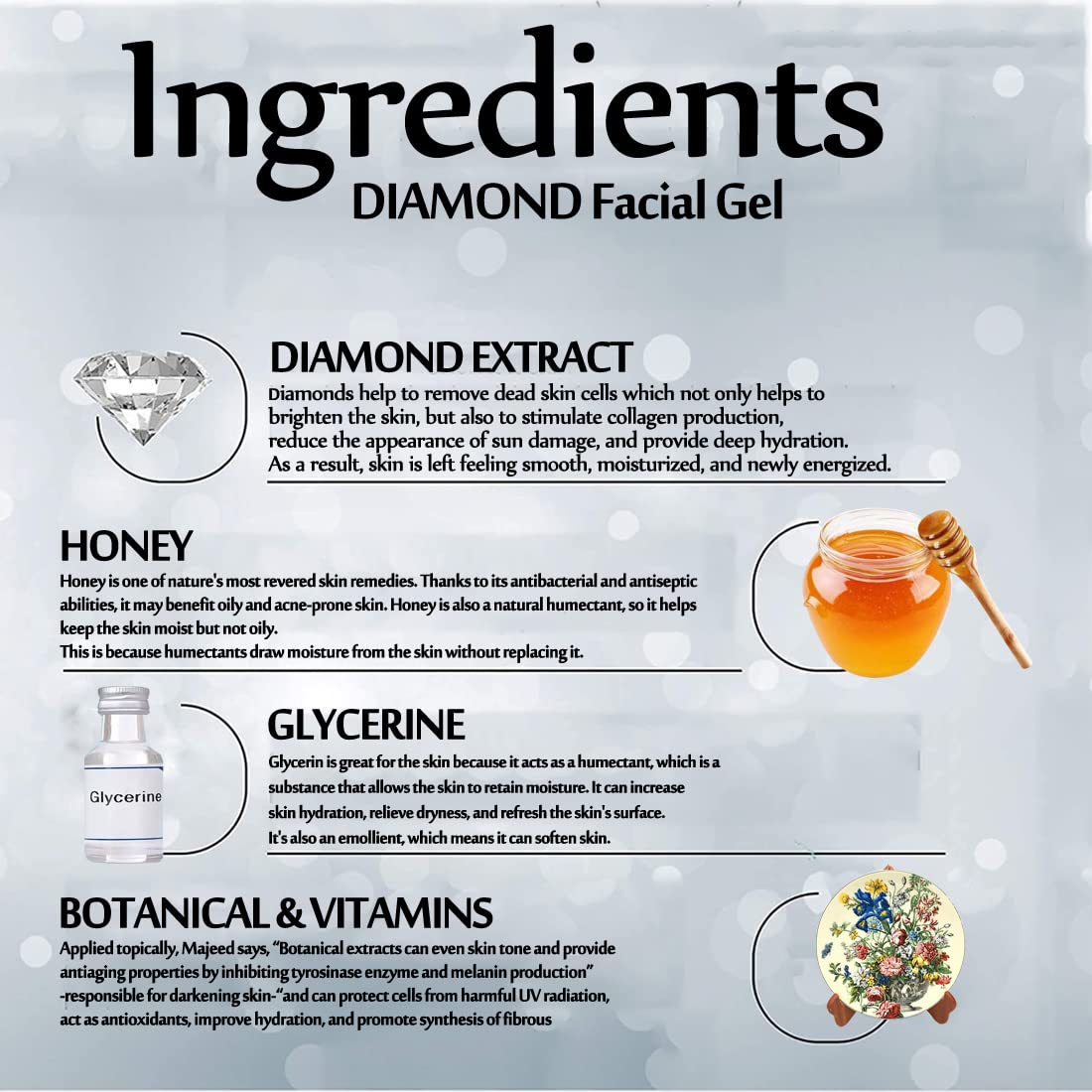Diamond Facial gel is good treatment for skin which help in exfoliate to your skin with removing pore-clogging residue that can lead acne inflammation and other skin problem infused with extra-fine diamond powder and with multi vitamins this facial gel wi