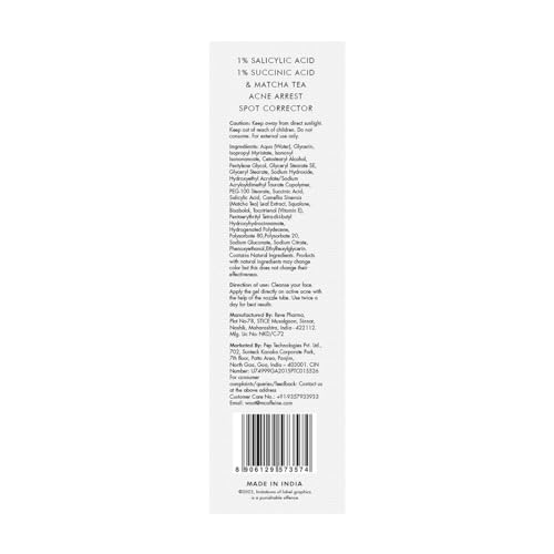 mCaffeine 1% Salicylic Acid Acne Arrest Spot Corrector with 1% Succinic Acid & Matcha Tea | Anti Acne Gel for Active Acne & Acne Scars | Reduces Acne Size & Redness | Soothing & Non-Drying for both Women and Men - 15 ml