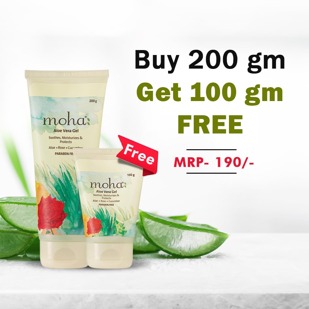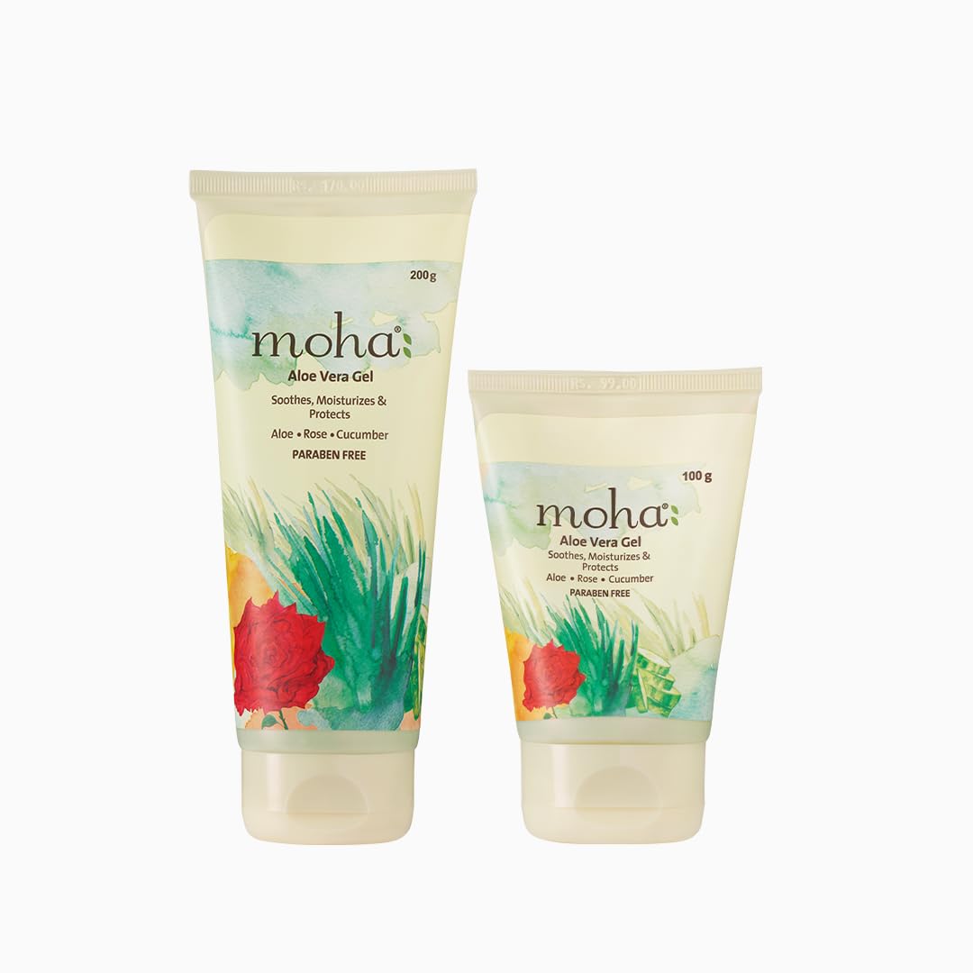 moha: Aloe Vera Gel a non-sticky Ayurvedic formula enriched with the added goodness of Rose and Cucumber to Soothe Moisturize and Protect your skin from daily damages. It hydrates the skin layers making it soft supple and radiant. moha: Aloe Vera Gel has multiple benefits for skin and hair.moha: Aloe Vera Gel helps to gently hydrate nourish and soothe the skin along with healing and rejuvenating action. This herbal Aloe Vera Gel has benefits for skin and hair.Backed by the house of Charak moha: brings you the Ayurvedic solution for your everyday skincare needs. Enriched with the herbal goodness of Aloe Vera Rose & Cucumber moha: Aloe Vera Gel nourishes skin & hair reduces acne & pimples and has soothing and hydrating effects on the skin.Ingredients:Aloe vera: A natural soothing moisturizing herb rich in Amino acids and Vitamins to provide the skin with desired glow and prevent pigmentation and fine lines Rose: A natural toner it reduces inflammation and maintains an even skin tone along with spreading a natural aroma which reduces stress Cucumber: Known for its rich hydrating and moisturising properties it gently nourishes and maintains skin elasticity.Directions:Use sufficient quantity of the gel and gently apply on the affected area for desired results.