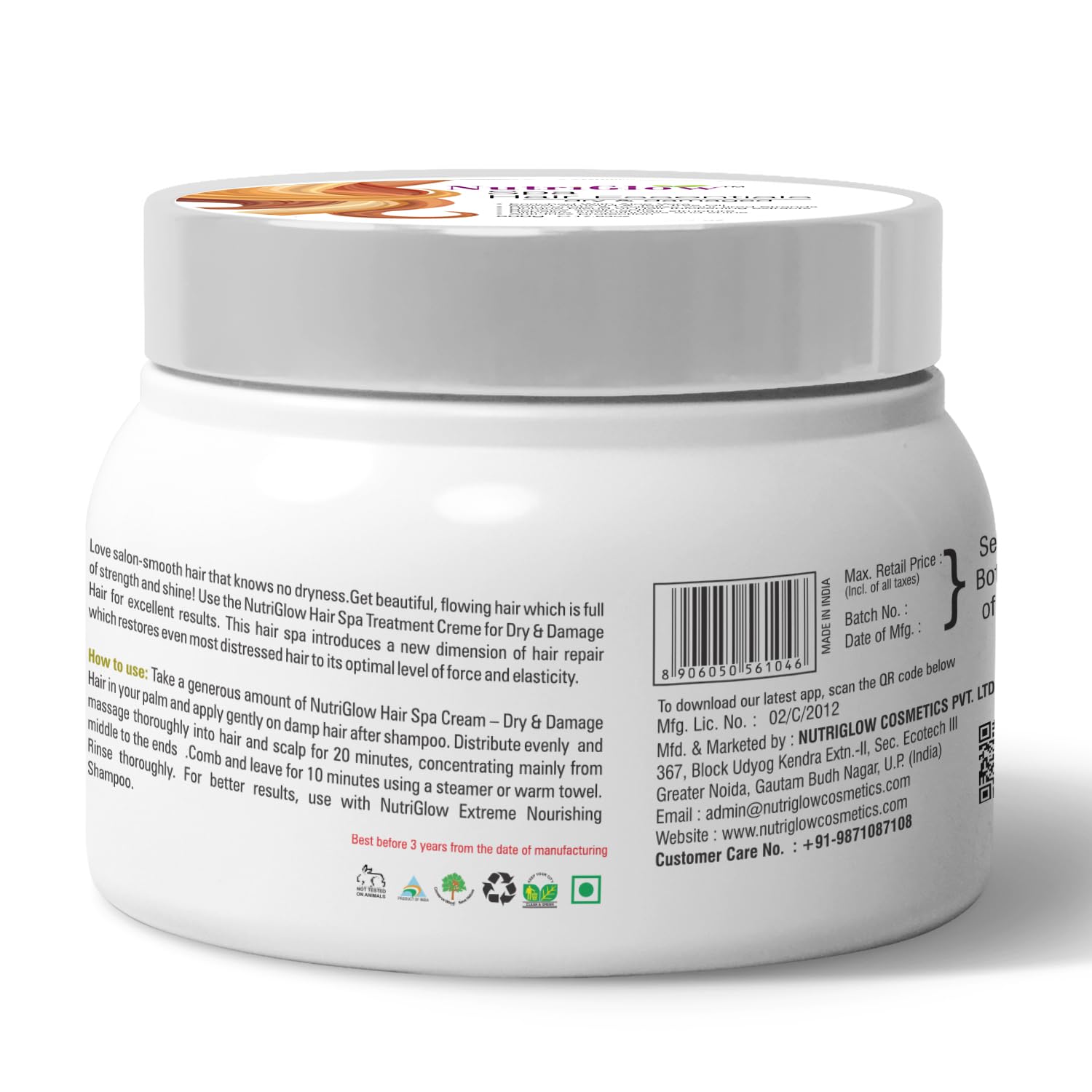 NutriGlow Hair Spa Cream with Damage Reverse & Moisture Lock Formulation for Dry & Damaged Hair - 300gHair spa nourishing cream bath - 490 g ideal for dry and damaged hair. Description the nourishing formula is based on purified water a cationic agent and conditioning silicone. The hair gains manageability and softness for healthy - looking hair with beautiful shine. For dual-action on hair and scalp: blend this cream bath with the appropriate scalp concentrate. Direction of use bland a generous amount of the smoothing cream bath with the corresponding scalp concentrate. Apply the blend to shampooed towel-dried hair. Distribute evenly and massage thoroughly into hair and scalp for 20 minutes.NutriGlow Aloe Vera Gel Great for Face Hair Acne Sunburn Bug Bites Rashes Glowing and Radiant Skin Hydrating Gel Relieves Itchy & Irritated Skin Non Sticky 100gmPamper your skin and hair with NutriGlow Aloe Vera gel the purest and the finest you can get in a bottle. Guaranteed 99 percent pure NutriGlow Aloe Vera gel has been hygienically extracted from ripe robust and succulent aloe vera leaves and packaged with care to retain its natural healing and rejuvenating goodness. Aloe vera has been used for thousands of years for beauty and medicinal benefits across cultures. Aloe vera is loaded with over 75 beneficial nutrients like vitamins enzymes minerals and amino acids. When applied topically on the skin it inhibits microbes and germs moisturizes skin. Similarly when applied to hair and scalp it conditions and protects hair from dryness and damage.