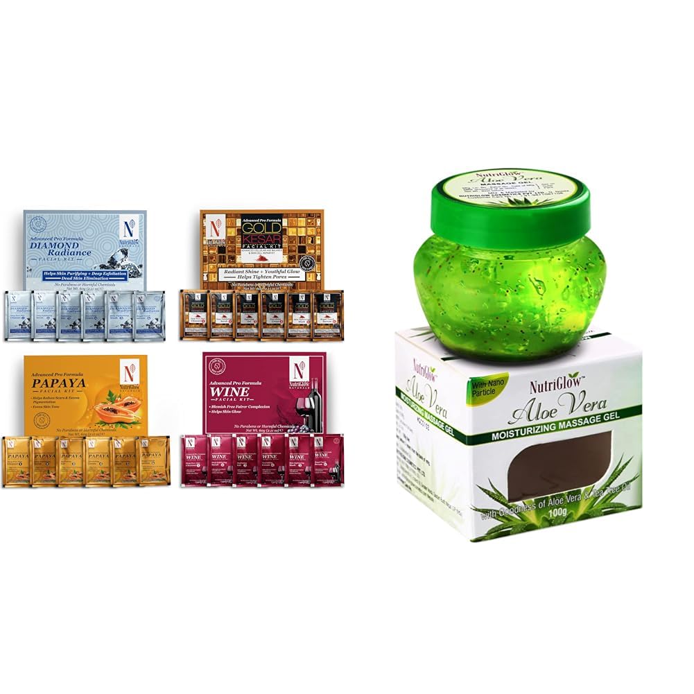 NutriGlow NATURAL'S Advanced Pro Formula Cleanup Kit All Type of Skin Solution for men & women 60 gm (Pack of 4)Elevate your skincare routine with our Combo of 4 Facial Kits curated to deliver professional-quality results in the comfort of your home. Experience the luxury of Diamond Radiance the indulgence of Wine the revitalization of Papaya and the luxury of Gold Kesar all in one comprehensive set. Each kit is meticulously crafted with premium ingredients to address various skin concerns from dullness to dryness ensuring a radiant complexion after each use. Pamper yourself with spa-like treatments without the hassle of salon appointments. Whether you want to hydrate or rejuvenate our facial kits offer versatile solutions for all skin types. Treat yourself or surprise a loved one with this convenient and economical pack designed to elevate your skincare regimen to new heights of indulgence.NutriGlow Aloe Vera Gel Great for Face Hair Acne Sunburn Bug Bites Rashes Glowing and Radiant Skin Hydrating Gel Relieves Itchy & Irritated Skin Non Sticky 100gmPamper your skin and hair with NutriGlow Aloe Vera gel the purest and the finest you can get in a bottle. Guaranteed 99 percent pure NutriGlow Aloe Vera gel has been hygienically extracted from ripe robust and succulent aloe vera leaves and packaged with care to retain its natural healing and rejuvenating goodness. Aloe vera has been used for thousands of years for beauty and medicinal benefits across cultures. Aloe vera is loaded with over 75 beneficial nutrients like vitamins enzymes minerals and amino acids. When applied topically on the skin it inhibits microbes and germs moisturizes skin. Similarly when applied to hair and scalp it conditions and protects hair from dryness and damage.
