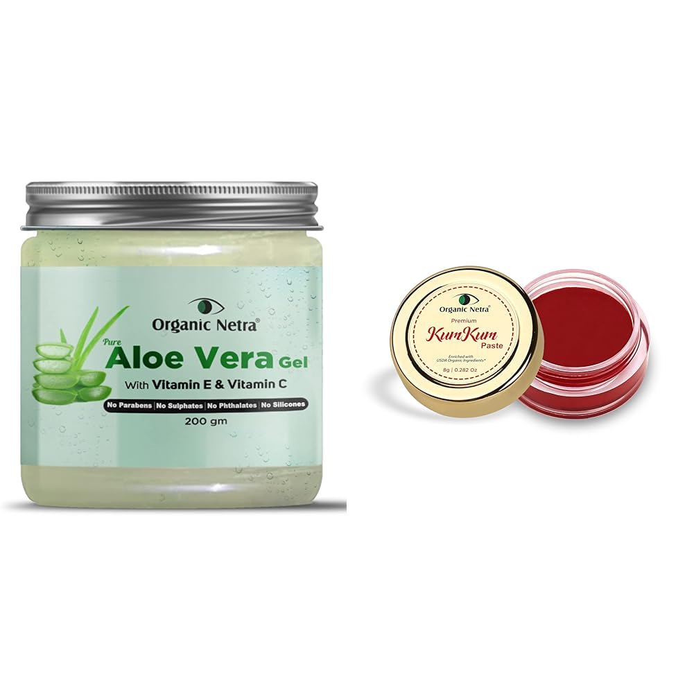 Organic Netra Pure Aloe Vera Gel with Vitamin C & E for Skin Face and Hair | Helps to Repair and Smoothens Hair | Relax and Renew your Skin and Scalp |Paraben Free & Sulphate Free - 200 GmOrganic Netra Aloe Vera Gel is sourced from the succulent natural originally grown aloe vera plant and ensures super high quality aloe vera gel with 0% Paraben 0% Silicone Hexane-free Non-GMO No Sulfates No Phthalates No Mineral Oils and extracted by cold-pressed technology make this the best aloe vera gel for skin and hair and Enriched with Vitamins C & E. Natural Aloe Vera Gel leaves your skin smooth silky and hydrated.Organic Netra Sindoor/Kumkum Paste | Waterproof Long lasting Smudge Proof Sindoor | Pure and Natural Deep Red Colour Long lasting | Enriched with Natural and Organic Ingredients -8gmCertain substances have been identified as things that can easily gather and retain energy. KumKum is a form of such energy. Applying KumKum on the forehead is a symbol of Indian culture and also of sacredness and auspiciousness. Tradition of wearing KumKum or Vermillion is said to have traveled through more than 5000 years of the Great Indian Culture. In ancient India KumKum was not made of synthetic dyes and chemicals instead it was made from herbs turmeric and lime which induced medicinal effects that promoted both the married life of the lady and health of herself. Also the location of applying is according to the alignment of âChakrasâ in human body. It reflects the piousness of a lady and that she is a symbol of strength power beauty and unity of a family. As Organic Netra KumKum Paste is blended with all organic and natural ingredients it gives nourishing effects to the divine energy of your body. It has active natural pigments which deliver intense color that does not fade for many hours and suitable for all skin types. Ingredients: Beeswax Vegetable Food Grade Colours Natural Fragrance Jojoba Oil Almond Oil Coconut Oil Turmeric Powde