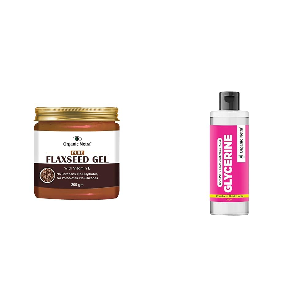 Organic Netra Pure Flaxseed Gel With Vitamin E For Hair & Skin Strengthens & Nourishes Hair & Skin Health Safe & Mild For All Skin Type Reduces Fine Lines & Wrinkles 200gMoisturize Your Skin & Define Your Curls Organic Netra pure flaxseeds gel is abundant in protein vitamins magnesium manganese selenium omega-3 fatty acids fibre and antioxidants making it a great plant-based addition to your beauty regime. The gel is enriched with vitamin E for soft supple & youthful skin. It offers anti-ageing benefits and also helps in soothing the skin by providing enhanced hydration. Our unalloyed flaxseed gel works well on undernourished curly wavy and dry hair by providing lustre and definition to them. Due to the presence of vitamin E vitamin B and other nutritional content flaxseed gel helps in the deep nourishment of the scalp and hair strands. It stimulates the hair follicles and increases circulation for stronger growth. Reduces Dark Spots & Pigmentation Evens Skin Tone & Texture Fights Acne & Breakouts Provides Deep Nourishment Maintains Moisture BarrieOrganic Netra Glycerine for Face |100% Pure & Natural Glycerine Liquid for Face Beauty and Skin Care | Pure & Unscented Glycerine | Suitable for All Skin Type - 200ml (Pack of 1)Organic Netra vegetable glycerine is made using Organic Vegetable Oils and other high-grade ingredients to give you an odorless and mildly sweet syrup that will moisturize your skin without any side effects. This organic liquid also promotes skin health and acts as a barrier to safeguard your skin from the elements including wind and cold. It cleanses your skin facilitates the regeneration of new skin evens out the skin tone and guards against the harmful effects of UV radiation.