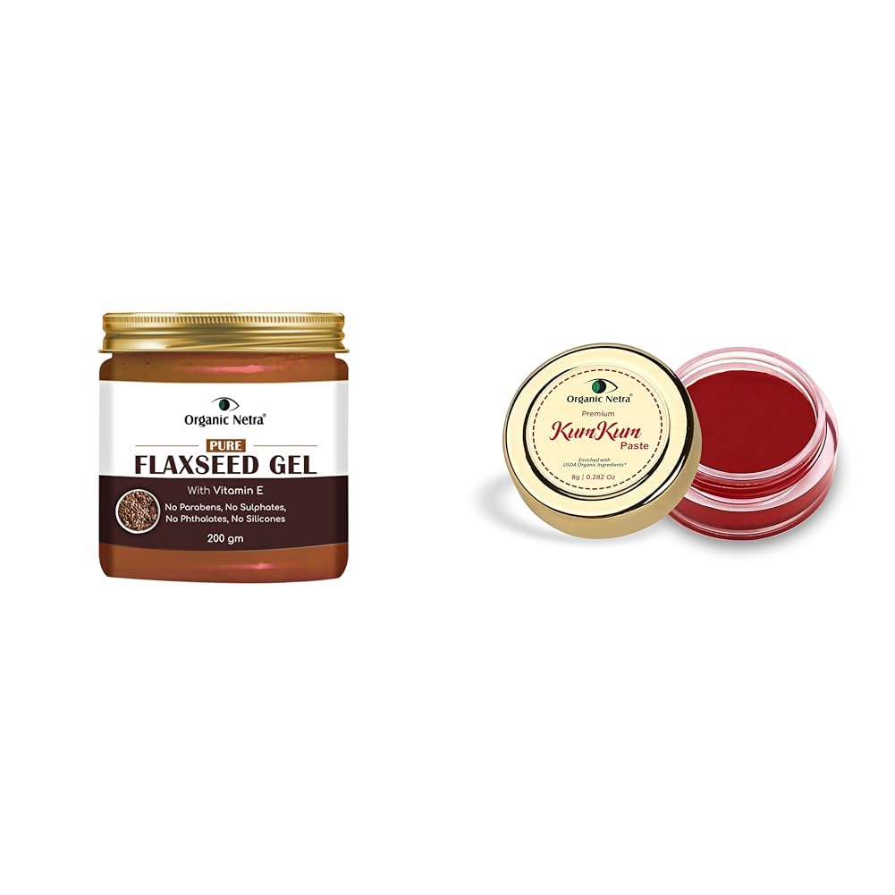Organic Netra Pure Flaxseed Gel With Vitamin E For Hair & Skin Strengthens & Nourishes Hair & Skin Health Safe & Mild For All Skin Type Reduces Fine Lines & Wrinkles 200gMoisturize Your Skin & Define Your Curls Organic Netra pure flaxseeds gel is abundant in protein vitamins magnesium manganese selenium omega-3 fatty acids fibre and antioxidants making it a great plant-based addition to your beauty regime. The gel is enriched with vitamin E for soft supple & youthful skin. It offers anti-ageing benefits and also helps in soothing the skin by providing enhanced hydration. Our unalloyed flaxseed gel works well on undernourished curly wavy and dry hair by providing lustre and definition to them. Due to the presence of vitamin E vitamin B and other nutritional content flaxseed gel helps in the deep nourishment of the scalp and hair strands. It stimulates the hair follicles and increases circulation for stronger growth. Reduces Dark Spots & Pigmentation Evens Skin Tone & Texture Fights Acne & Breakouts Provides Deep Nourishment Maintains Moisture BarrieOrganic Netra Sindoor/Kumkum Paste | Waterproof Long lasting Smudge Proof Sindoor | Pure and Natural Deep Red Colour Long lasting | Enriched with Natural and Organic Ingredients -8gmCertain substances have been identified as things that can easily gather and retain energy. KumKum is a form of such energy. Applying KumKum on the forehead is a symbol of Indian culture and also of sacredness and auspiciousness. Tradition of wearing KumKum or Vermillion is said to have traveled through more than 5000 years of the Great Indian Culture. In ancient India KumKum was not made of synthetic dyes and chemicals instead it was made from herbs turmeric and lime which induced medicinal effects that promoted both the married life of the lady and health of herself. Also the location of applying is according to the alignment of âChakrasâ in human body. It reflects the piousness of a lady and that she is a symbol of strength power beauty and unity of a family. As Organic Netra KumKum Paste is blended with all organic and natural ingredients it gives nourishing effects to the divine energy of your body. It has active natural pigments which deliver intense color that does not fade for many hours and suitable for all skin types. Ingredients: Beeswax Vegetable Food Grade Colours Natural Fragrance Jojoba Oil Almond Oil Coconut Oil Turmeric Powde