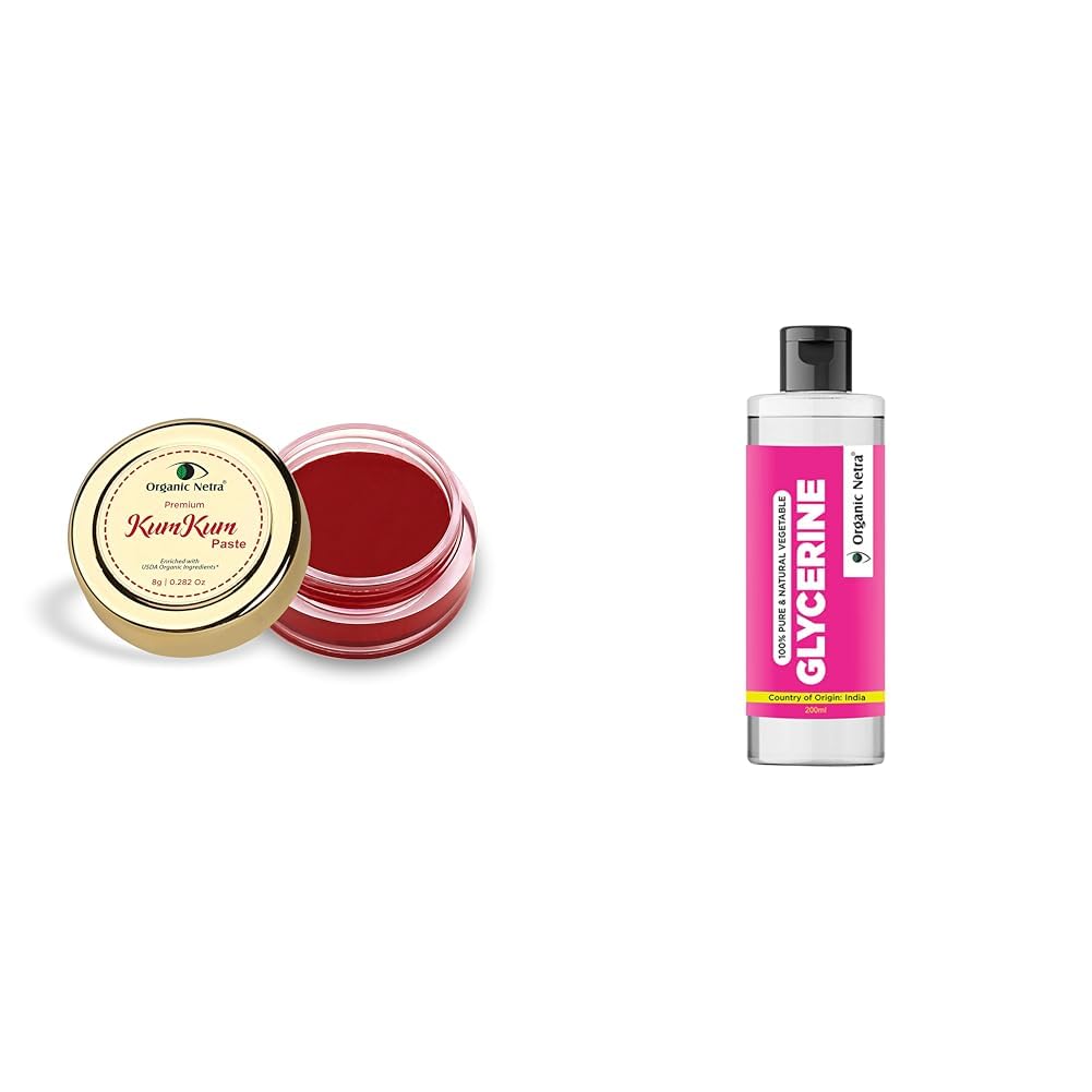 Organic Netra Sindoor/Kumkum Paste | Waterproof Long lasting Smudge Proof Sindoor | Pure and Natural Deep Red Colour Long lasting | Enriched with Natural and Organic Ingredients -8gmCertain substances have been identified as things that can easily gather and retain energy. KumKum is a form of such energy. Applying KumKum on the forehead is a symbol of Indian culture and also of sacredness and auspiciousness. Tradition of wearing KumKum or Vermillion is said to have traveled through more than 5000 years of the Great Indian Culture. In ancient India KumKum was not made of synthetic dyes and chemicals instead it was made from herbs turmeric and lime which induced medicinal effects that promoted both the married life of the lady and health of herself. Also the location of applying is according to the alignment of âChakrasâ in human body. It reflects the piousness of a lady and that she is a symbol of strength power beauty and unity of a family. As Organic Netra KumKum Paste is blended with all organic and natural ingredients it gives nourishing effects to the divine energy of your body. It has active natural pigments which deliver intense color that does not fade for many hours and suitable for all skin types. Ingredients: Beeswax Vegetable Food Grade Colours Natural Fragrance Jojoba Oil Almond Oil Coconut Oil Turmeric PowdeOrganic Netra Glycerine for Face |100% Pure & Natural Glycerine Liquid for Face Beauty and Skin Care | Pure & Unscented Glycerine | Suitable for All Skin Type - 200ml (Pack of 1)Organic Netra vegetable glycerine is made using Organic Vegetable Oils and other high-grade ingredients to give you an odorless and mildly sweet syrup that will moisturize your skin without any side effects. This organic liquid also promotes skin health and acts as a barrier to safeguard your skin from the elements including wind and cold. It cleanses your skin facilitates the regeneration of new skin evens out the skin tone and guards against the harmful effects of UV radiation.