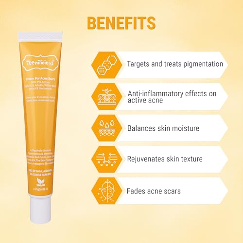 Teenilicious Face Cream for Acne Scars is a lightweight solution that efficiently targets acne scars unclogs pores and gently exfoliates to combat both active acne and acne scars promoting youthful and elegant skin.
