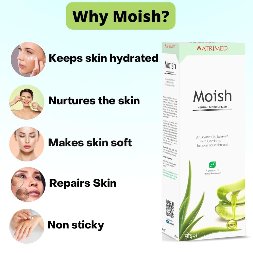 Product Description: Atrimed Moish Ayurvedic Skin Moisturizer is a herbal skincare solution designed for deep nourishment and long-lasting hydration. Enriched with time-tested Ayurvedic ingredients like Aloe Vera Cardamom Yashti Neem and Almond this lotion delivers intensive care for dry to normal skin. Aloe Vera hydrates and soothes Cardamom offers anti-inflammatory benefits and Yashti helps reduce pigmentation. Its lightweight formula absorbs easily forming a protective layer to lock in moisture without clogging pores. Use it daily for naturally glowing well-moisturized skin. Important Information: Safety Information: Keep out of reach of children. For external use only. Avoid contact with eyes. Perform a patch test before first use. Indications: Helps in moisturizing dry skin. Suitable as a daily moisturizer for all skin types. Ingredients: Aloe Vera Cardamom Yashti (Licorice) Almond Neem Directions for Use: Apply Moish lotion after bath with gentle massaging all over the body once or twice daily for best results.