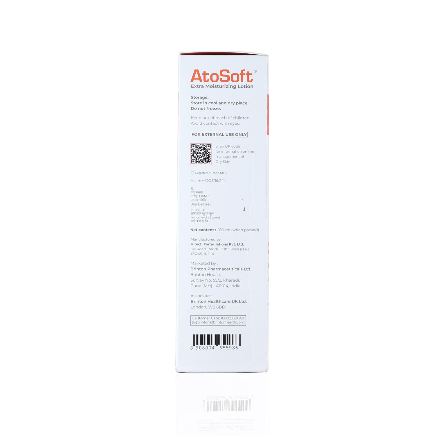 Atosoft extra Moisturizing Lotion- A unique formulation to heal repair nourish moisturize and protect the baby's dry and itchy skin. Works naturally and gently to repair the skin barrier. Long lasting moisturization keeps the skin duration. Atsoft Extra Moisturizing Body Lotion is safe on baby's skin. The non-greasy formula makes it suitable in all season and for all types of skin. Key Ingredients- Oat lipids (Ceramides & Phytosterols) Borage Oil ( GLA) Niacibamide Shea Butter Dexpanthenol. Features- Reduce dryness by increasing triple lipids in the stratum corneum. Repair and restore the skin barrier. Ensure long lasting Moisturizing effect Relieves Itching. Reduce Inflammation & use of topical corticosteroids. Fragrance free Phthalate Free Paraben Free Dyes Free. Enriched with Ceramides & GLA. Microdroplets ensure fast absorption Spreads easily and Non greasy. pH 5.5 Skin friendly