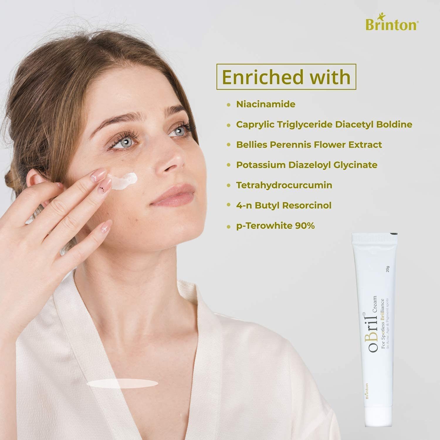 Brinton Obril Cream gives you spotless and brighter skin. The cream has been dermatologically tested. It reduces dark spot pimple spot helps smooth and tone ageing and wrinkled skin. Obril Cream Loaded with the best ingredients for your face such as N- Butyl Resorcinol Niacinamide Tetrahydrocurcumin Terowhite Potassium Azeloyl Glycinate and Bellis Perennis (Daisy) Flower extract to reduce the appearance of wrinkles crow feet circles & fine lines. The ingredients of this cream have antioxidant properties that protect the skin from free radicle damage and helps to keep the skin looking younger.