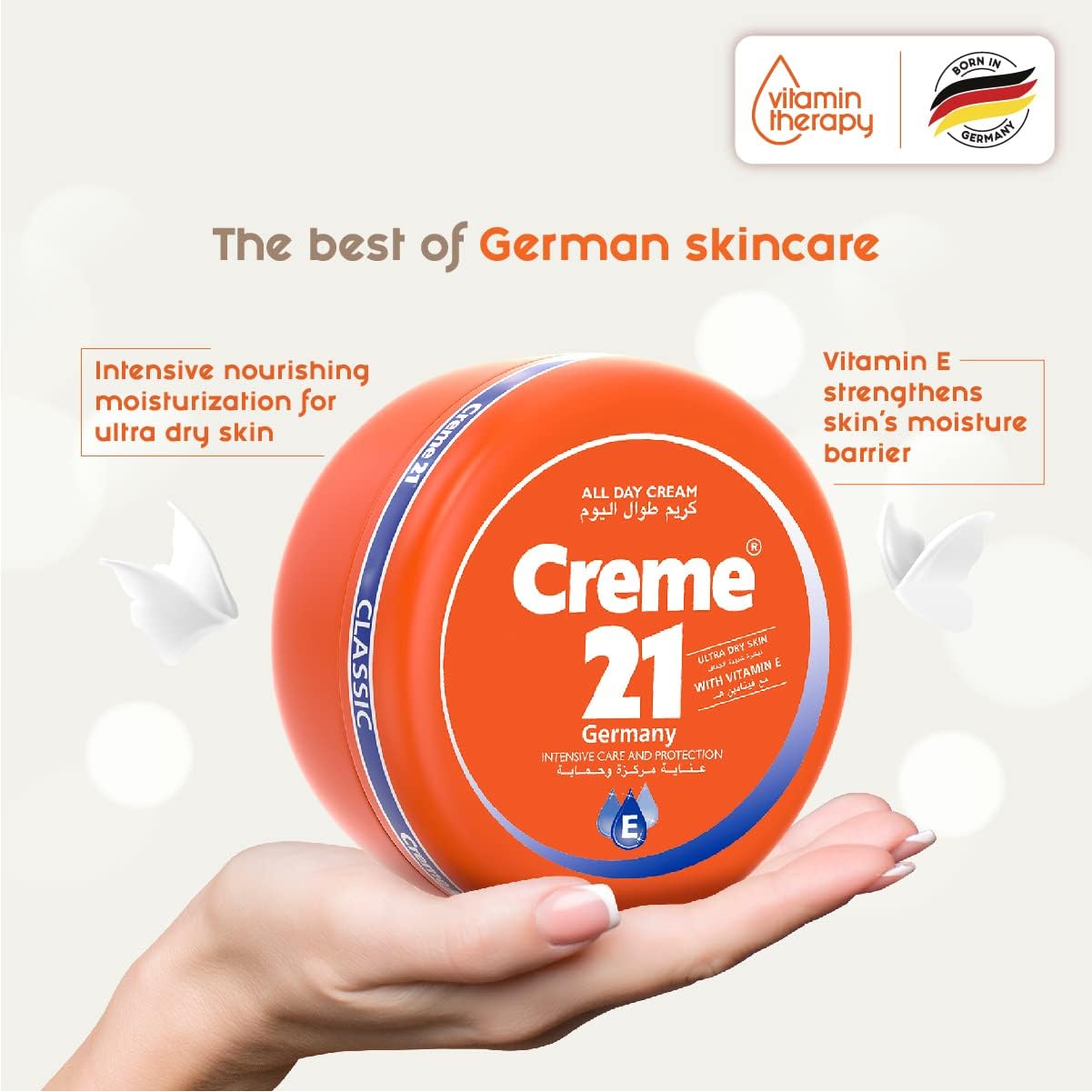 Tired of the rough dry and under nourished feeling skin? Try the Cr¨me 21 All Day Cream. But first why choose Cr¨me 21? Cr¨me 21 With years of German Skin Care Expertise has Powerful mix of Vitamin E & Pro - Vitamin B5 which makes your skin HEALTHY & GLOWING Vitamin E is a powerful antioxidant that may be effective at reducing UV damage and deeply nourishes your skin. Pro-Vitamin B5 helps to keep skin soft smooth and healthy How to use? Scoop product onto hands. Rub on palms. Gently massage over face & body. Use daily for nourished and healthy skin