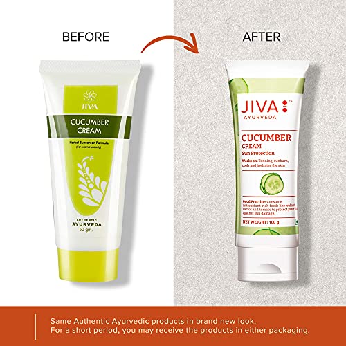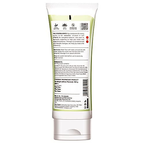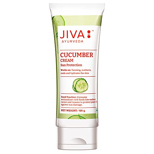 A natural sunscreen cream Jiva Cucumber Cream with SPF 30 protects your skin from the harmful effects of UV rays and sun tanning. Made with pure herbs extract and oil this cream is suitable for usage for all skin types and is paraben and silicone-free. It contains the goodness of herbs like Cucumber Carrot Wheat Germ Lodhra Sandalwood Sunflower and Yashad Bhasma. The main ingredient of the cream Cucumbers has natural antioxidant and analgesic (pain-relieving) properties. Therefore it helps soothe the skin in case of sunburns. Its cooling and hydrating properties keep the skin moisturised and nourished and protects against UV damage. The beta carotene in Carrot also protects your skin from UV damage and improves skin appearance. Wheat Germ oil is a potent UVB and UVA absorber. It also restores a smooth radiance and elasticity to the skin.