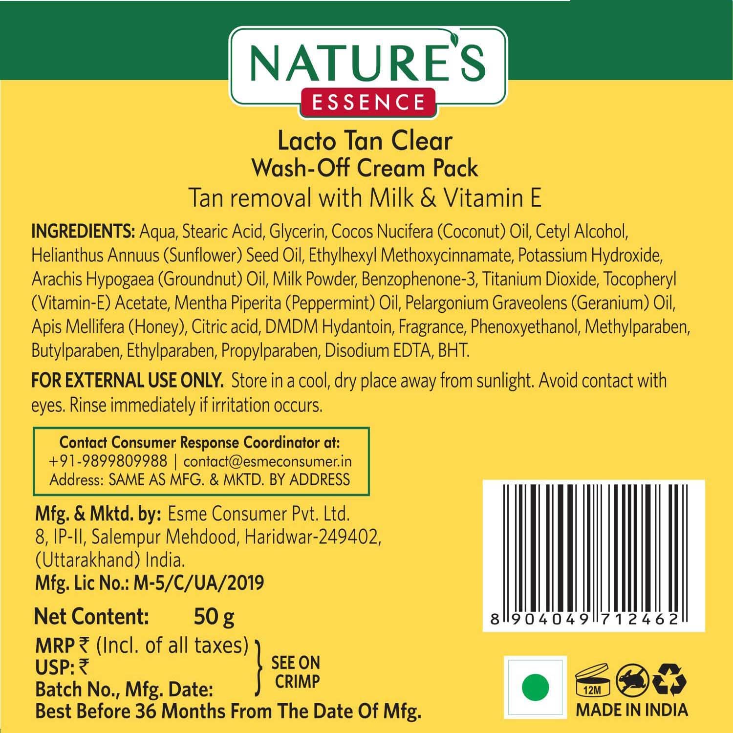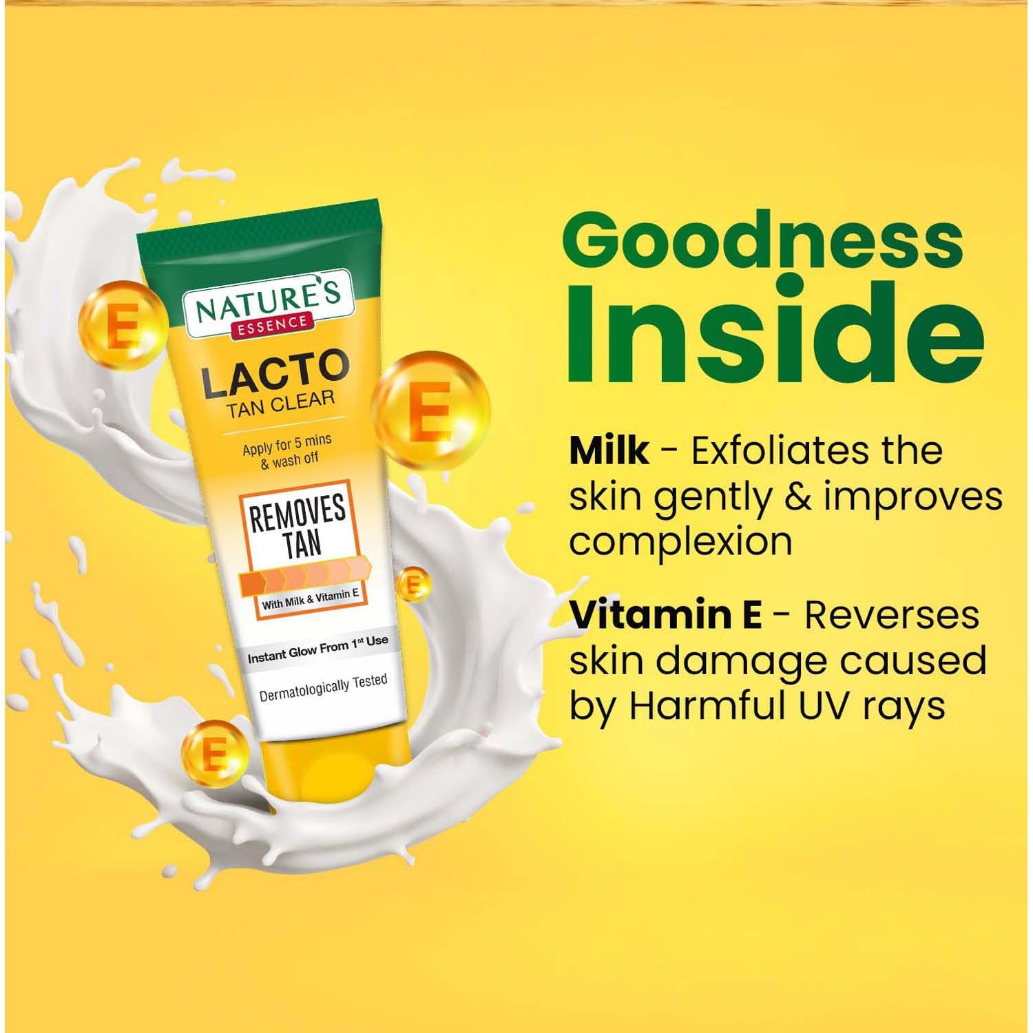 Power of natural ingredients: Made up of milk and Vitamin E formula the Nature Essence Daily De-Tan Lacto Tan Clear removes layers of tan that get accumulated on the face to reveal a bright and glowing skin.